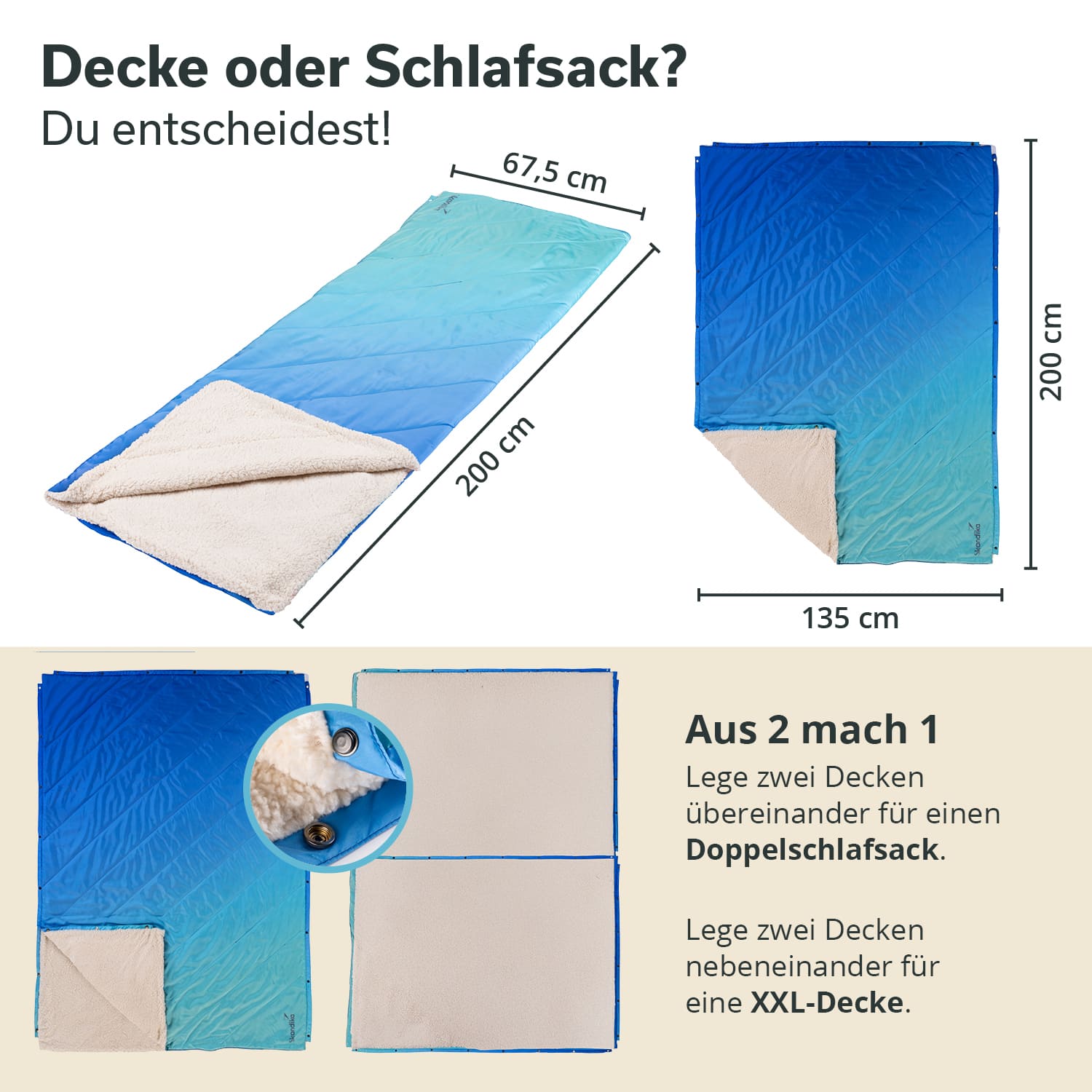 - 2 Decken übereinander geknöpft für einen gemütlichen Doppelschlafsack für 2 Personen