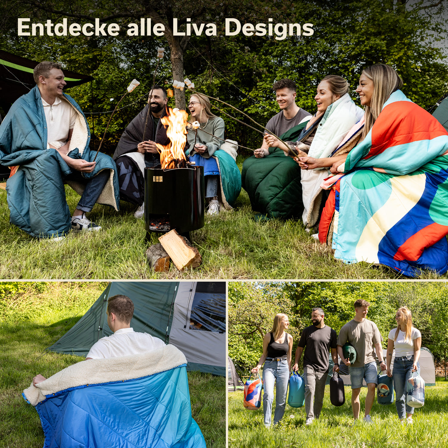 Unsere gemütliche Campingdecke Liva ist ein echtes Multitalent – denn Komfort kennt kein festes Format! Ob beim Camping, im Van, am Lagerfeuer oder beim Picknick – diese wandelbare Reisedecke passt sich flexibel jeder Situation an. Sie lässt sich als Kuscheldecke, Schlafsack, Cape oder Kissen verwenden und sorgt unterwegs wie zu Hause für wohlige Wärme und Geborgenheit.