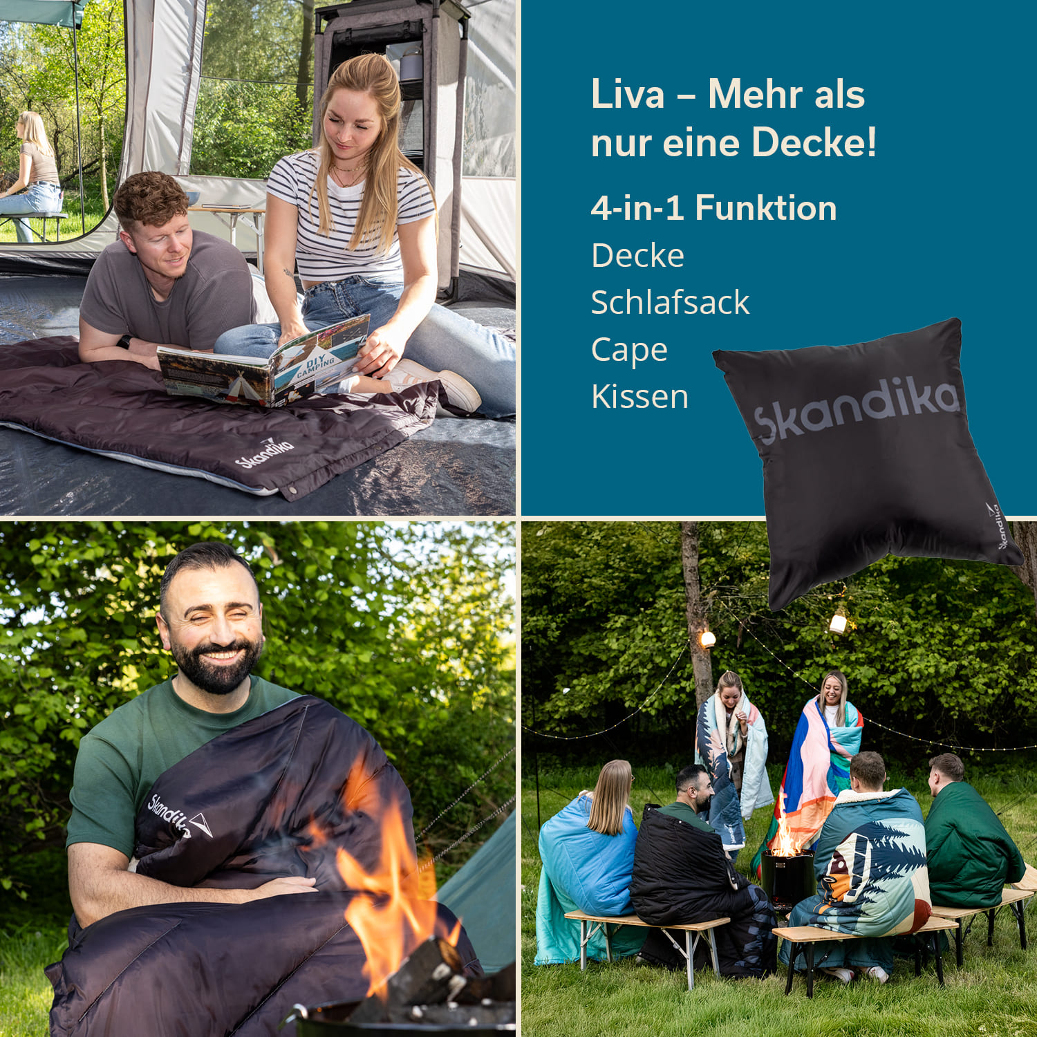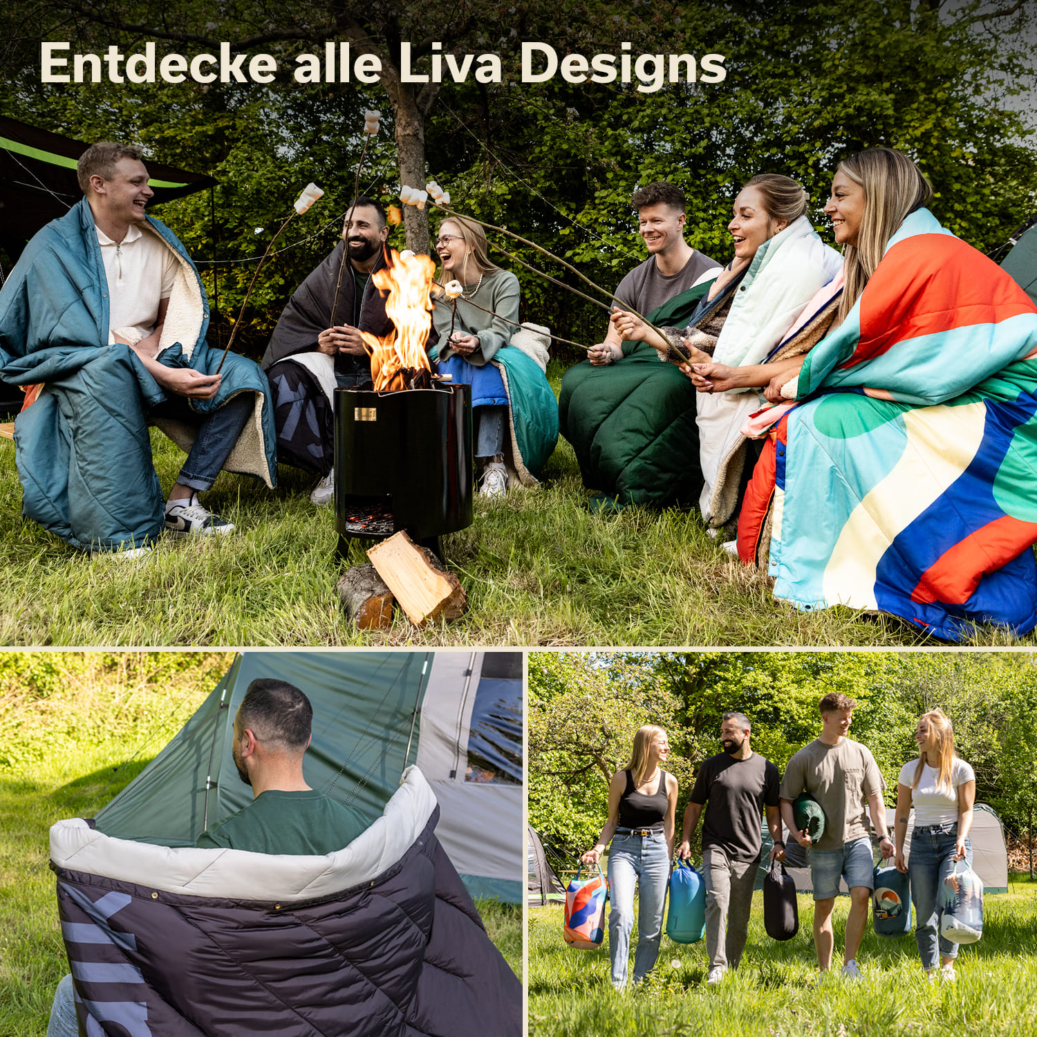 Unsere gemütliche Campingdecke Liva ist ein echtes Multitalent – denn Komfort kennt kein festes Format! Ob beim Camping, im Van, am Lagerfeuer oder beim Picknick – diese wandelbare Reisedecke passt sich flexibel jeder Situation an. Sie lässt sich als Kuscheldecke, Schlafsack, Cape oder Kissen verwenden und sorgt unterwegs wie zu Hause für wohlige Wärme und Geborgenheit.