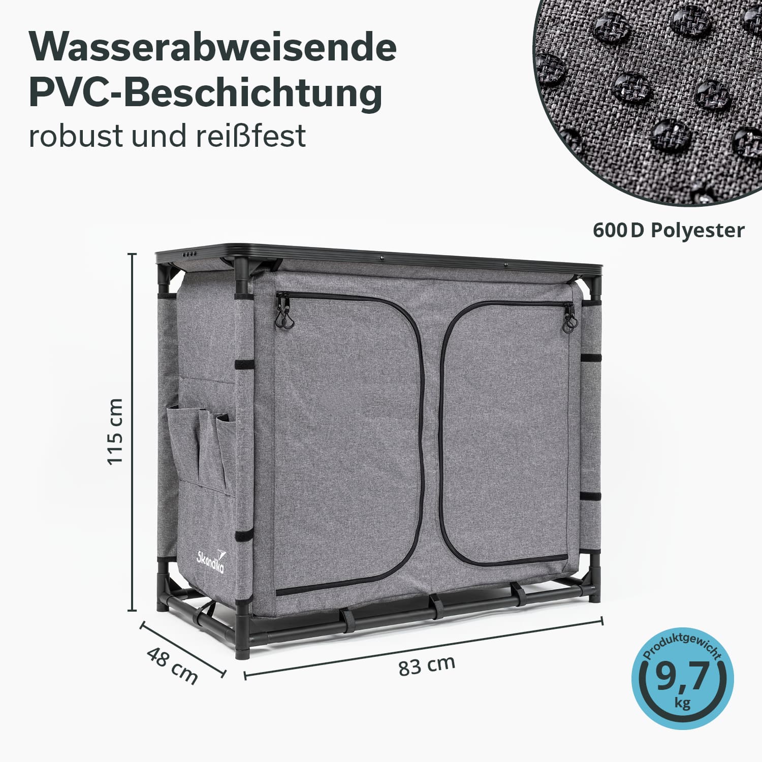 Mit einer Gesamtbelastbarkeit von 50 kg ist der Campingschrank bestens geeignet, um Kleidung, Ausrüstung und Zubehör sicher zu verstauen.