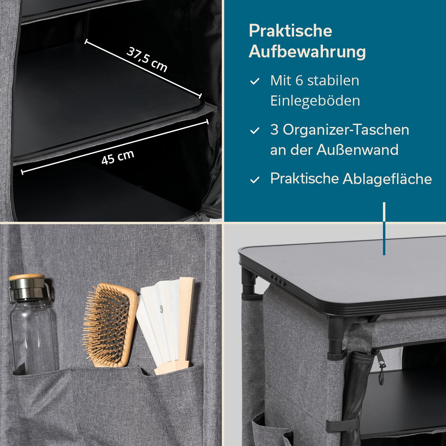 Die obere Fläche eignet sich ideal als Arbeits- oder Abstellfläche, etwa für Campingkocher, Küchenhelfer oder Reisebedarf.