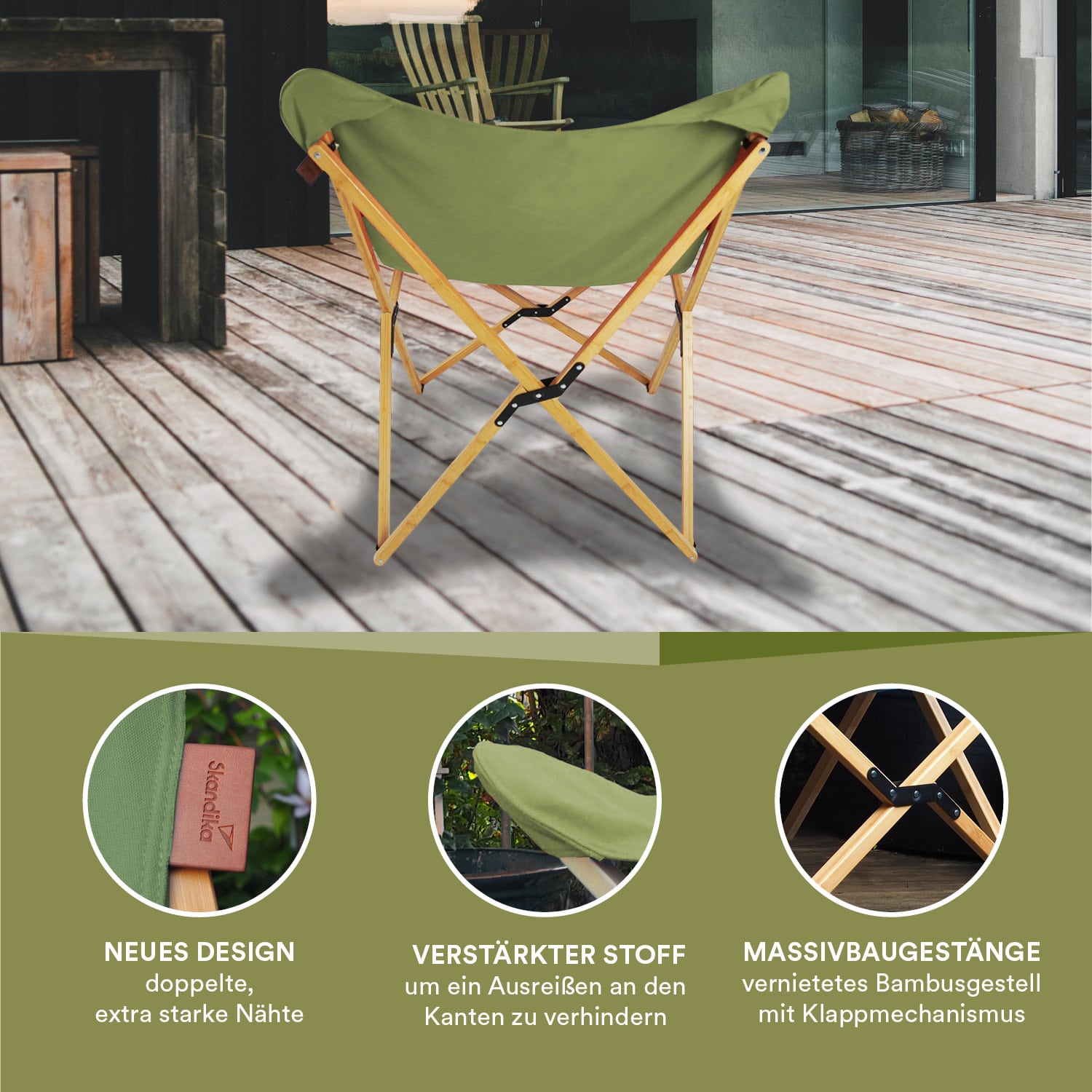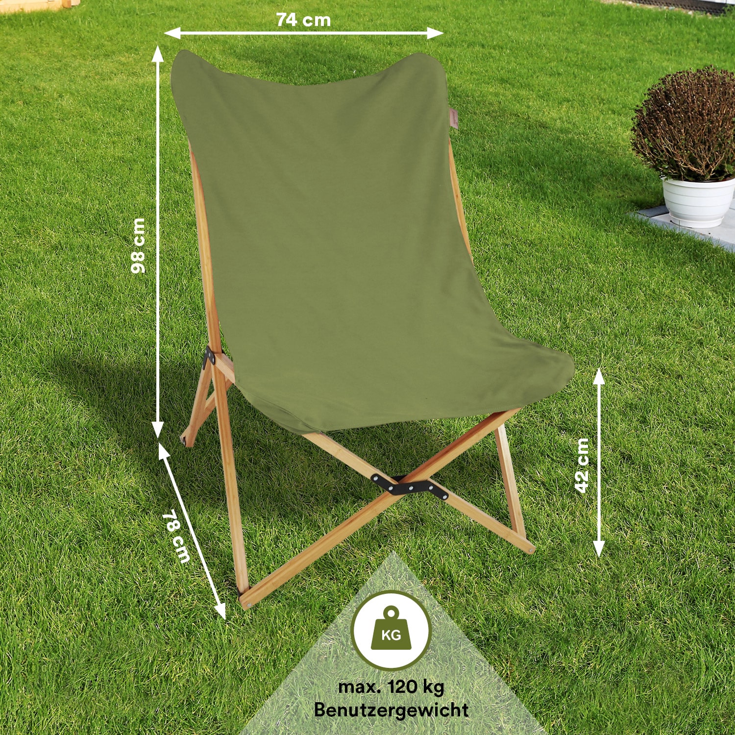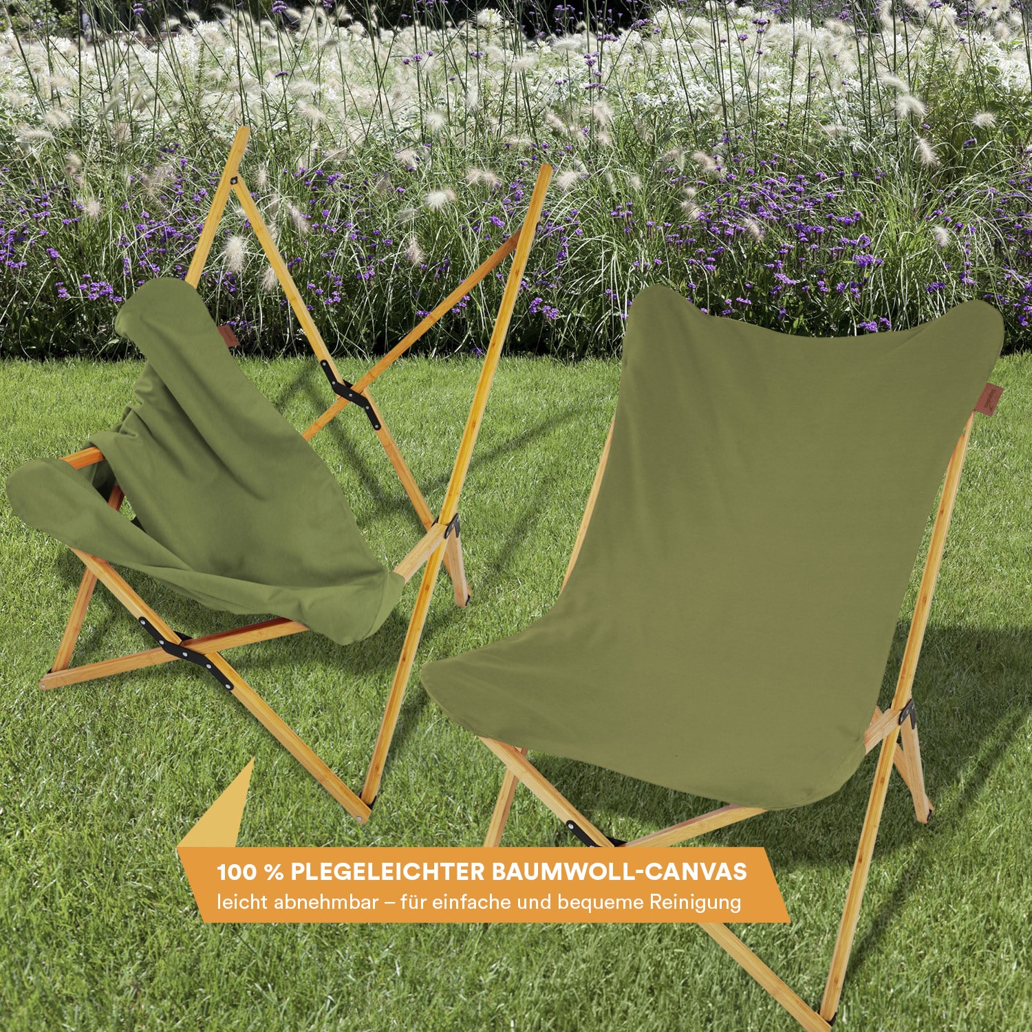 Das Gestell aus reinem Bambus ist sehr stabil und wetterfest, sodass der Stuhl auch dem schlechtesten Wetter trotzen kann.