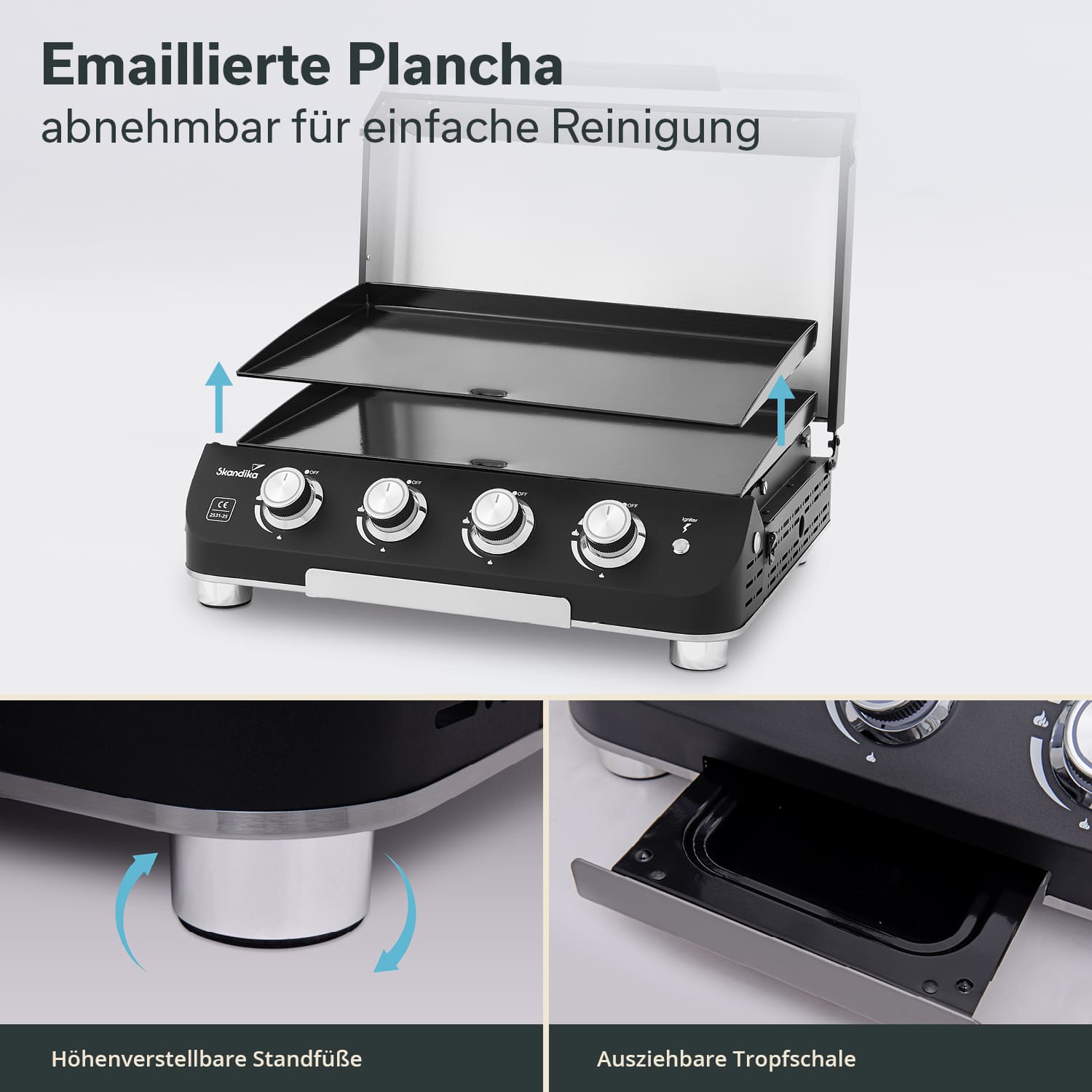 Der Skandika Tischgrill hat eine edle, schwarzgepulverte Oberfläche, die nicht nur schick aussieht, sondern auch langlebig und pflegeleicht ist. Nachdem die Plancha abgekühlt ist kann die Grillplatte abgenommen und die Fettabtropfschale herausgenommen werden, damit Fett und Öl entsorgt und alle Teile einfach gereinigt werden können.