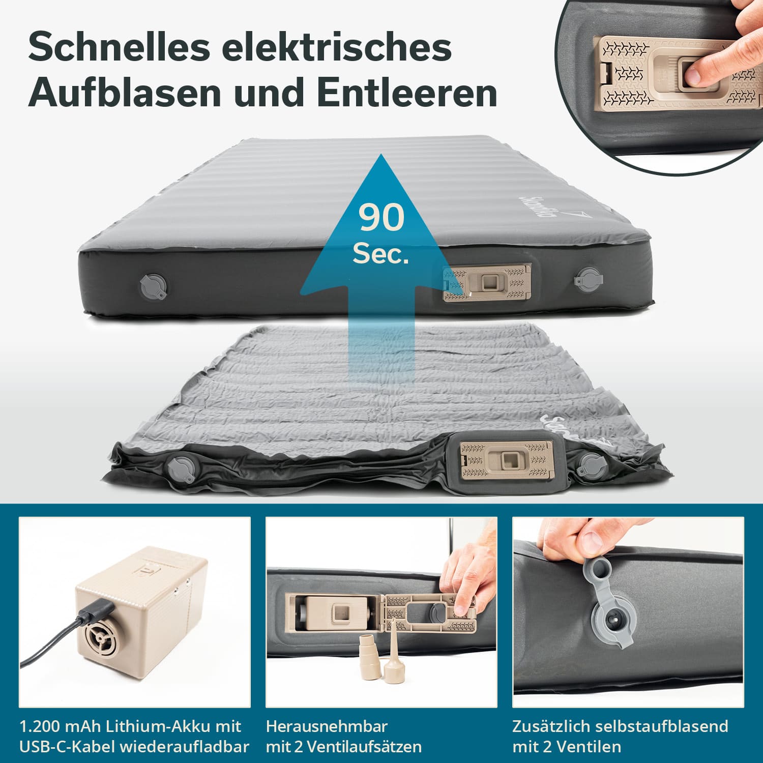 Zwei starke Ventile ermöglichen das Aufblasen auch ohne Pumpe, falls der Akku einmal leer sein sollte.
