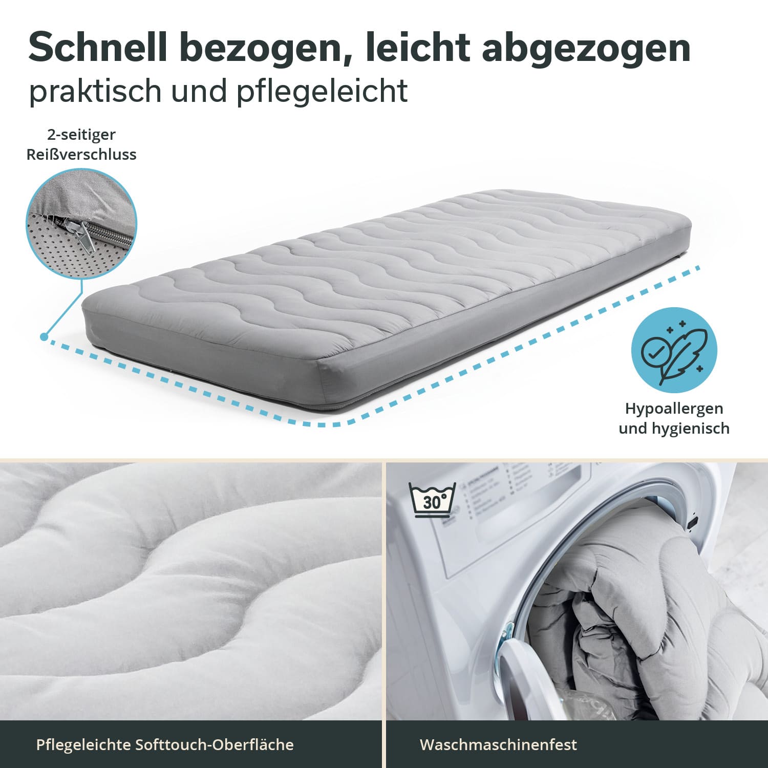 - Bezug mit Antirutsch-Noppen an der Unterseite, Eckreißverschluss, maschinenwaschbar (30 °C)
