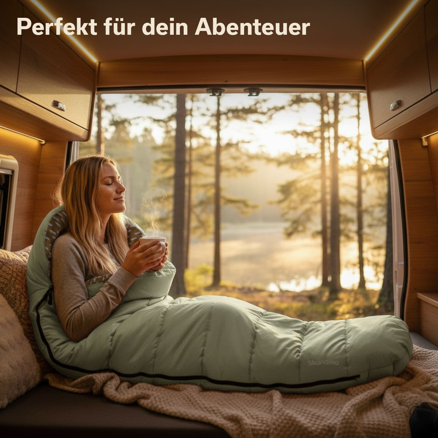 Unser Skandika Schlafsack Vegas in Mumienform und XXL-Größe hat einen besonders geräumigen Schnitt. Er bietet eine Menge an Platz und vor allem unruhige und bewegungslustige Schläfer oder Seitenschläfer finden mit Vegas genau die richtige Schlafumgebung.