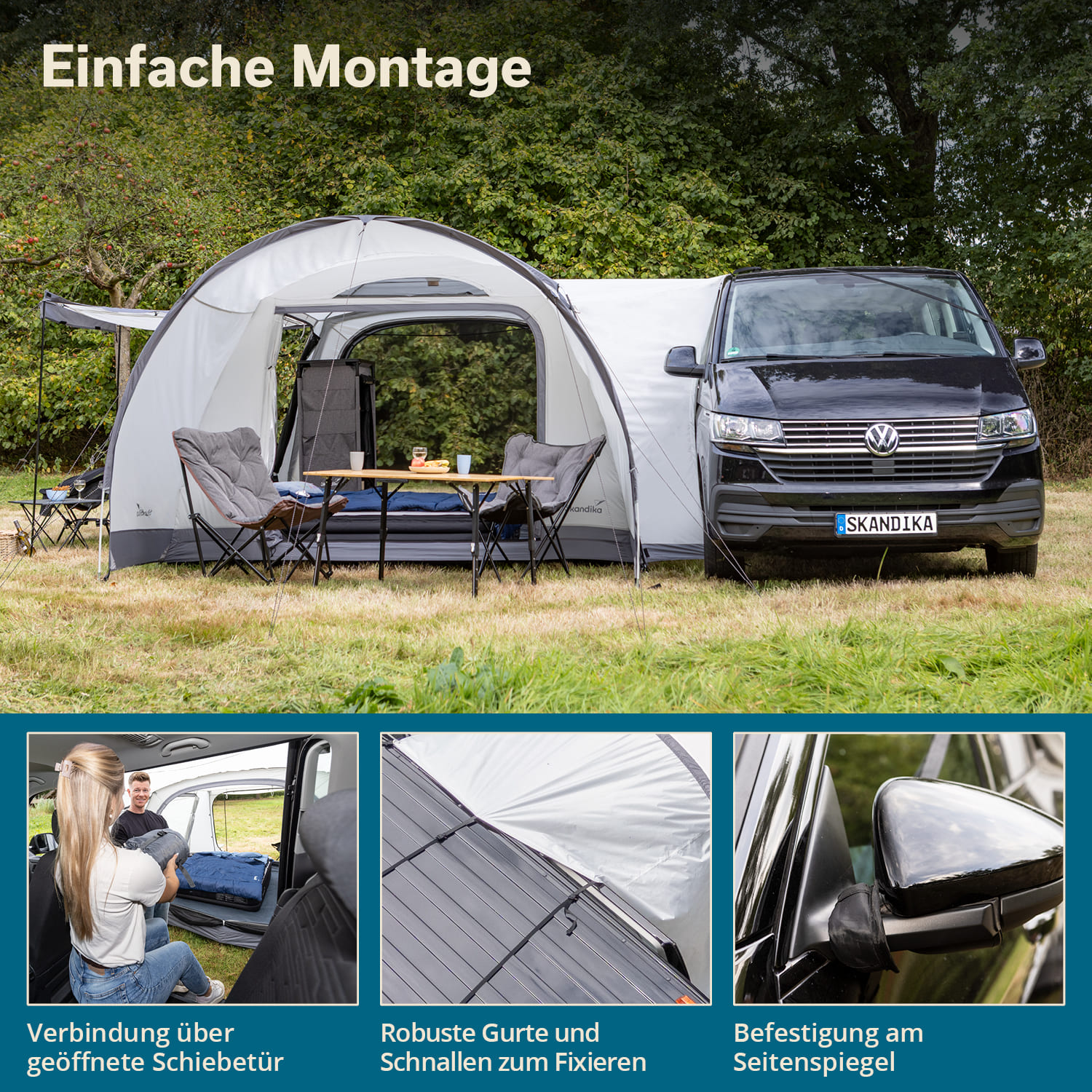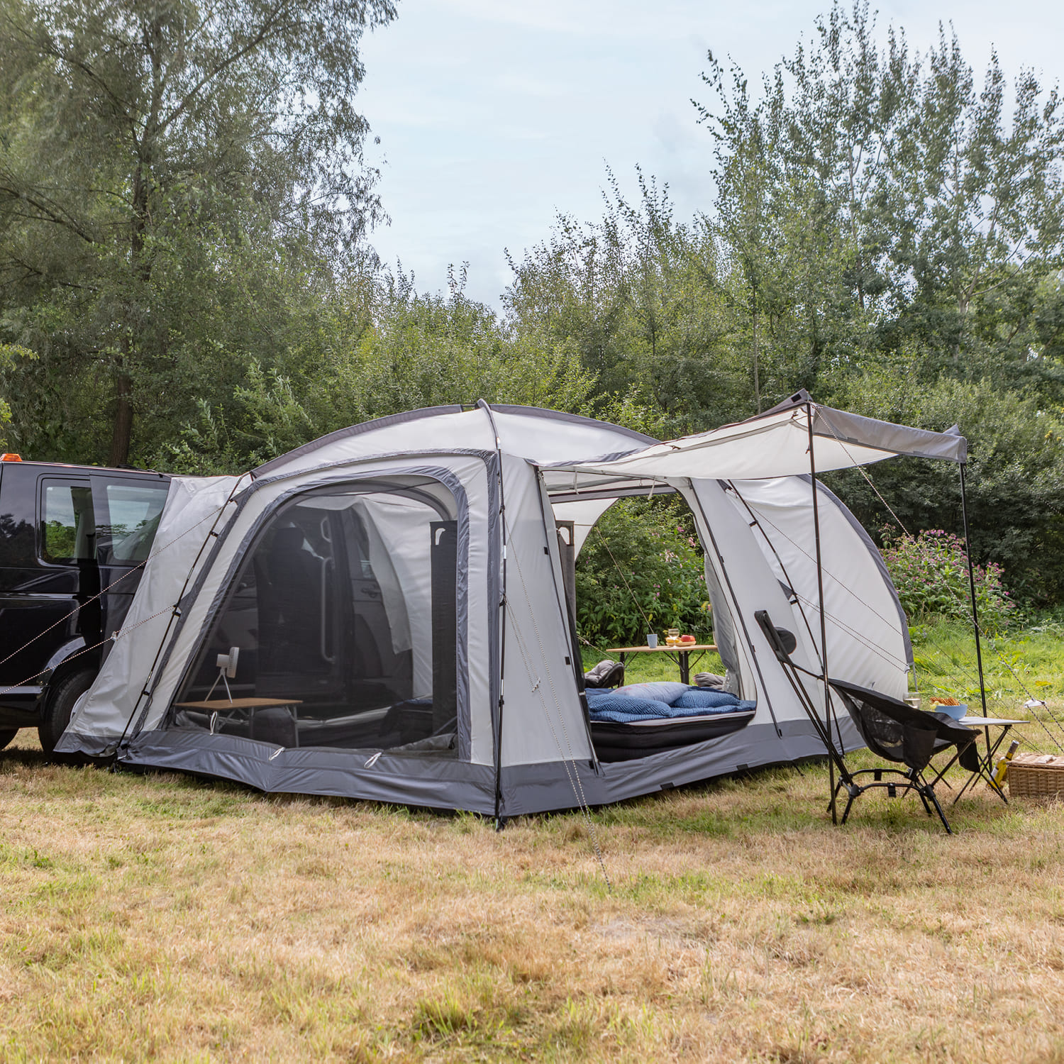 Die mitgelieferte Van-Schleuse ist schnell installiert und ermöglicht einen wettergeschützten Übergang zwischen Zelt und geöffneter Schiebetür – passend für die meisten handelsüblichen Kastenwagen- und Minivan-Modelle.