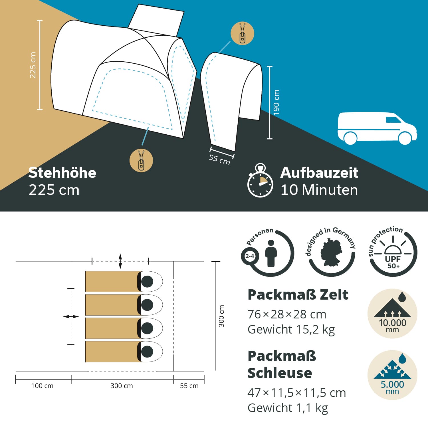 - Maße Zelt: 300 × 300 + 100 cm / Stehhöhe 225 cm / Packmaß 76 × 28 × 28 cm / Gewicht 15,2 kg