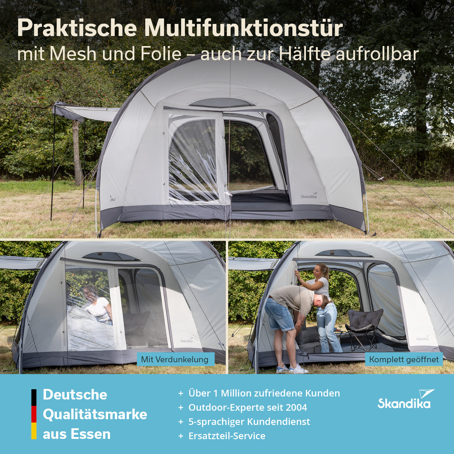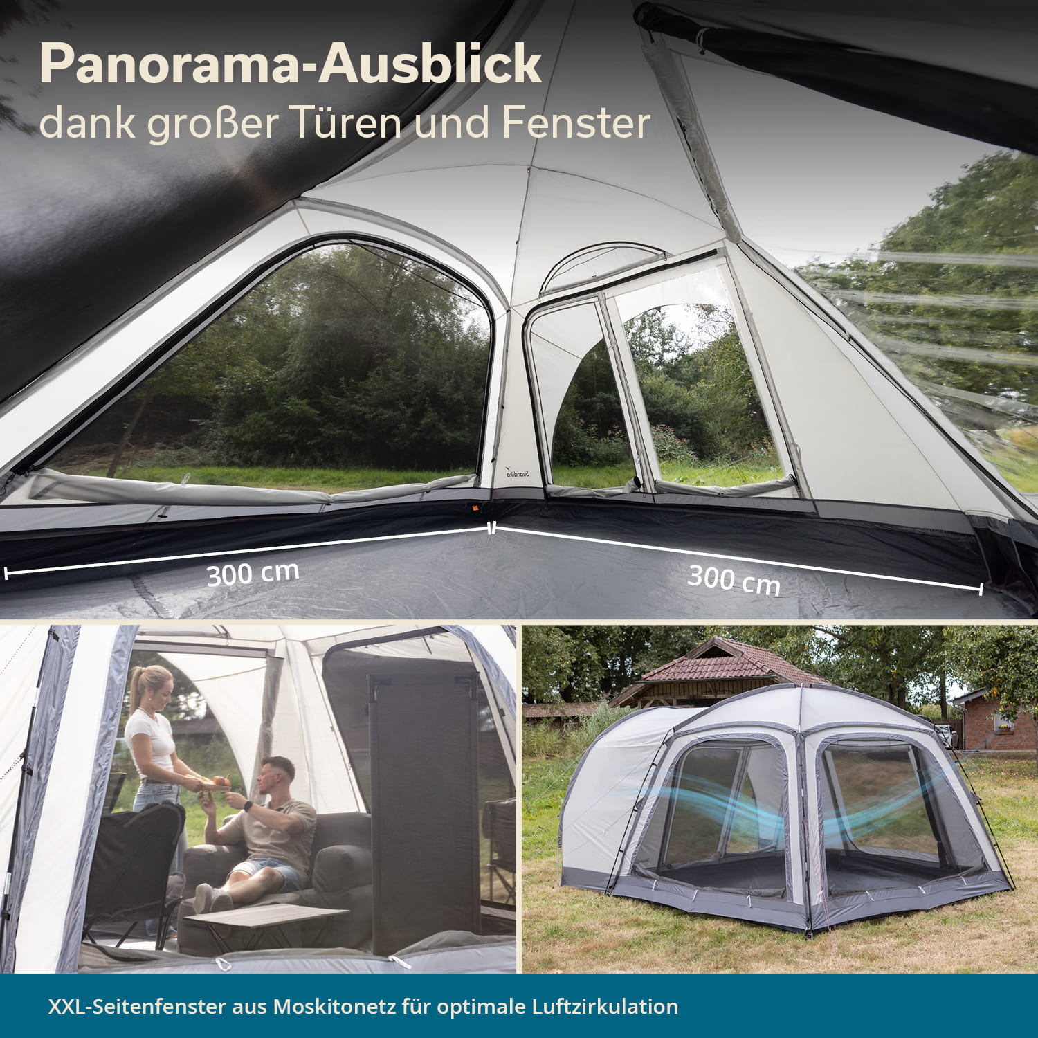 - Fest integriertes Vordach mit Seitenwänden, große Panoramafenster aus Moskitonetz