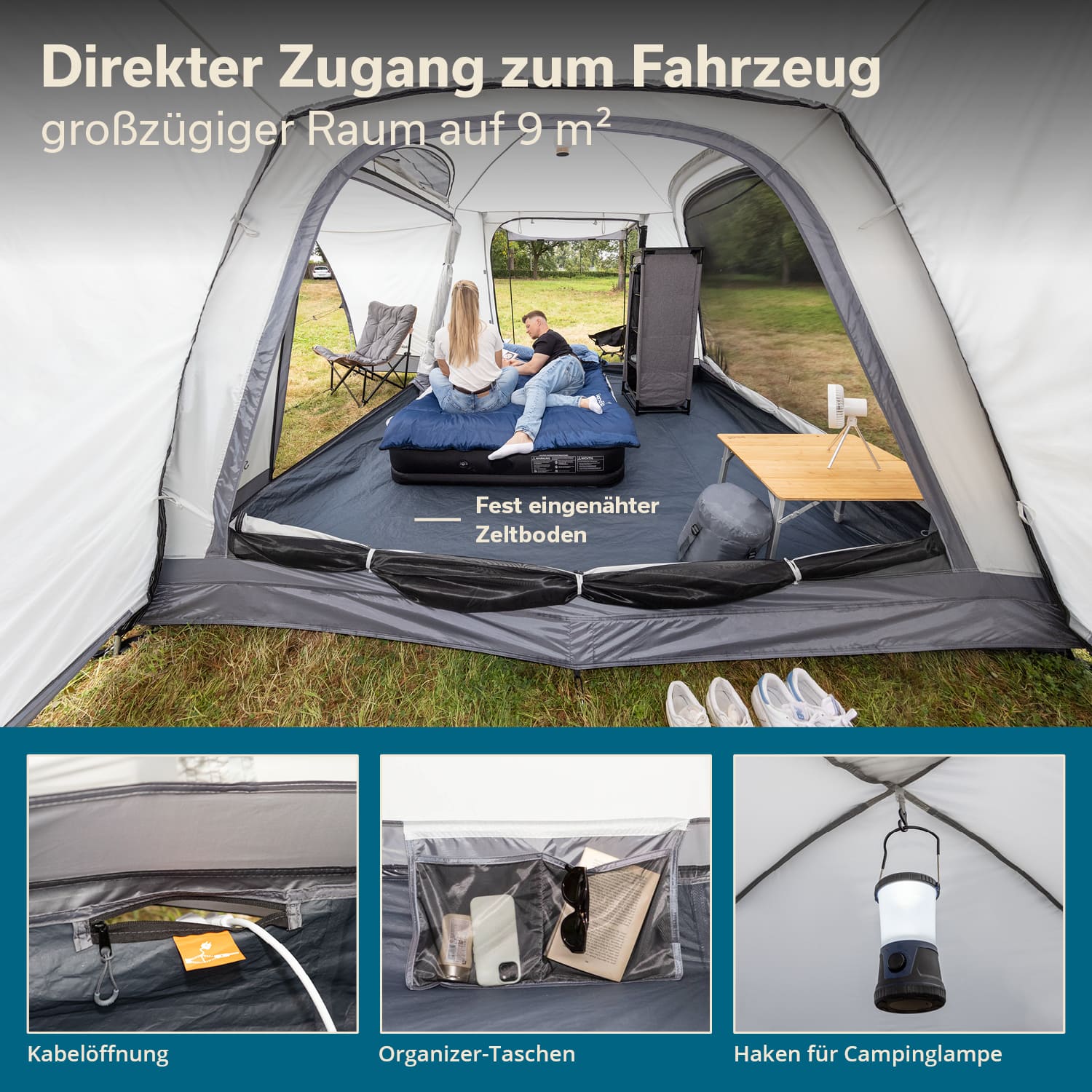 Praktische Extras wie ein Haken für die Aufhängung einer Campinglampe, Organizer-Taschen, eine geschützte Kabelöffnung und reflektierende Abspannseile sorgen für zusätzlichen Komfort und Sicherheit.