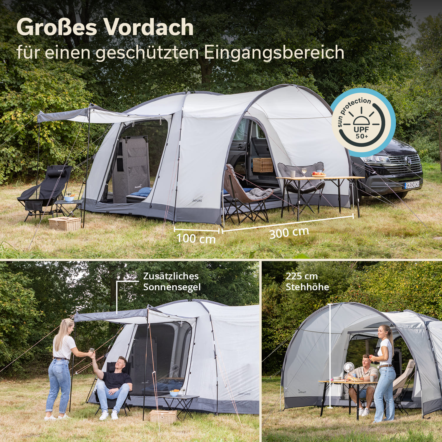Das Zelt kann auch freistehend aufgebaut werden, und auch das Auto bleibt trotz Schleuse flexibel nutzbar – einfach lösen, losfahren, wieder andocken. Perfekt für Tagesausflüge während des Campingurlaubs.