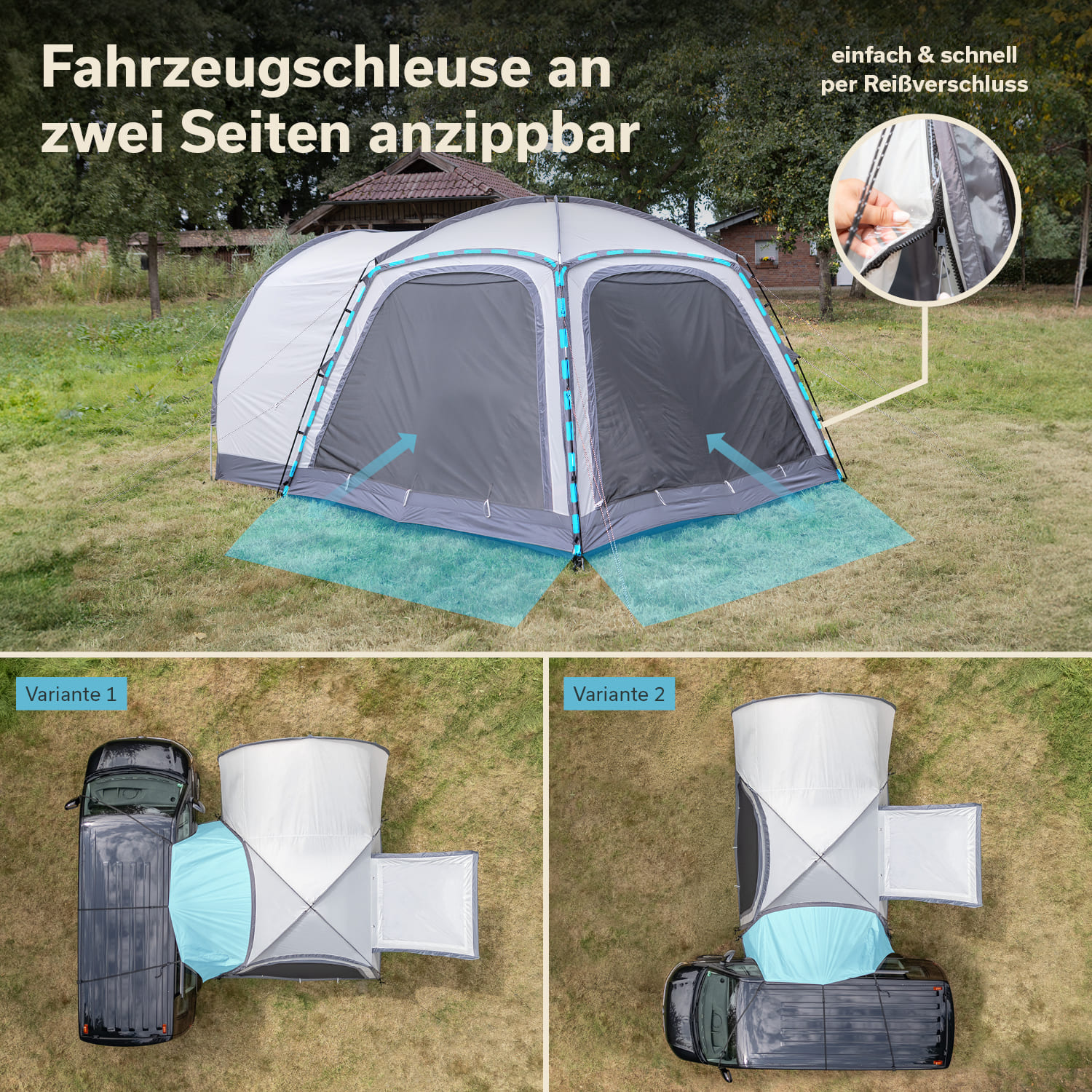 Dank Reißverschlüssen an zwei der Zeltwände kann die Fahrzeugschleuse wahlweise seitlich oder gegenüber vom Haupteingang am Zelt angebracht werden – für maximale Raumnutzung vor Ort.
