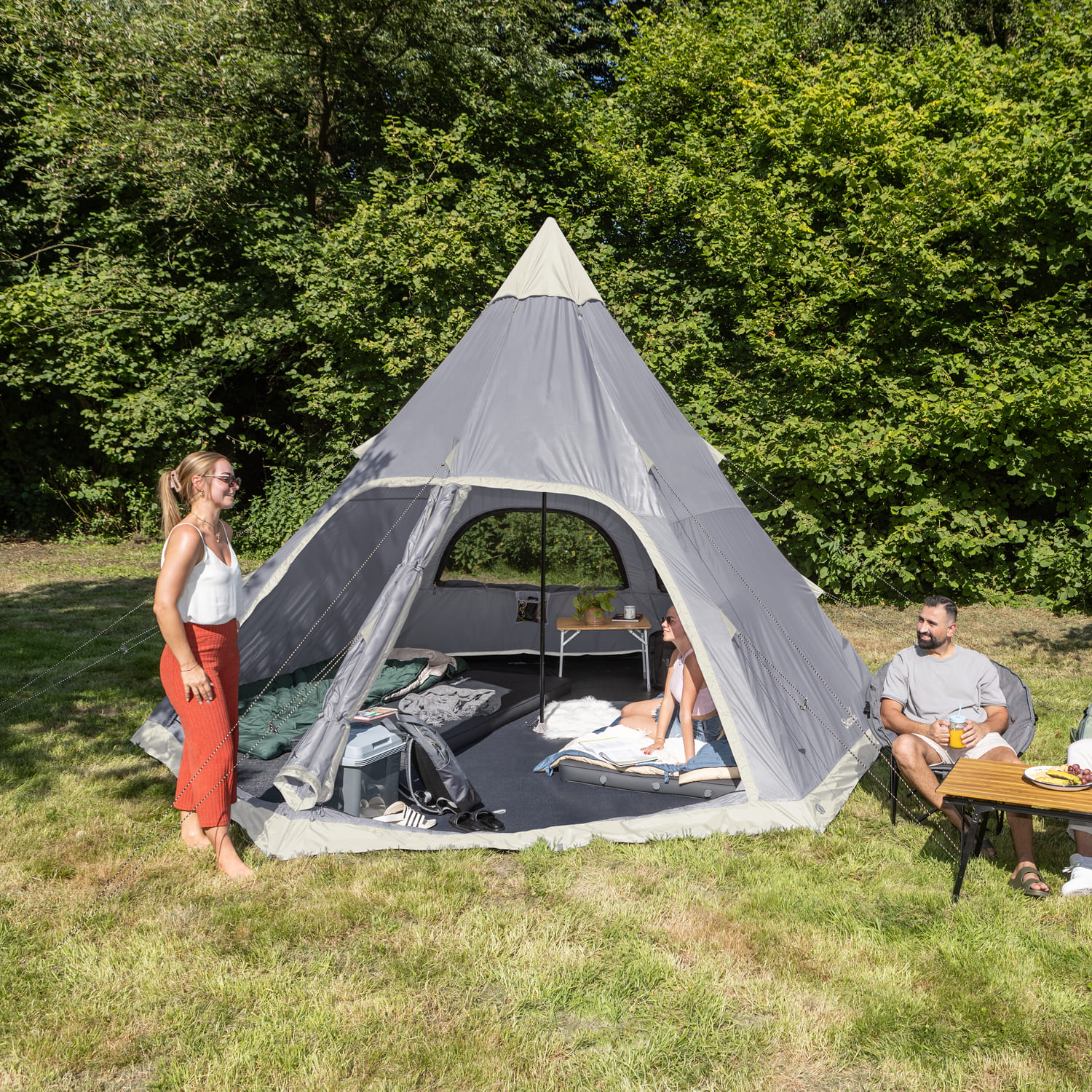 - Helles Tipi-Zelt für bis zu 6 Personen mit zentraler Stange und einer Höhe von 295 cm