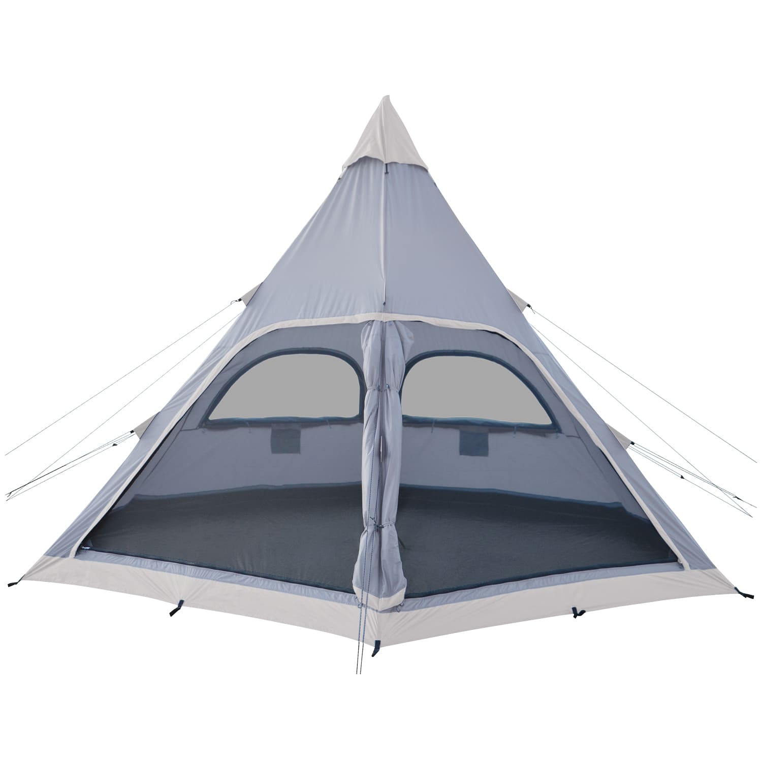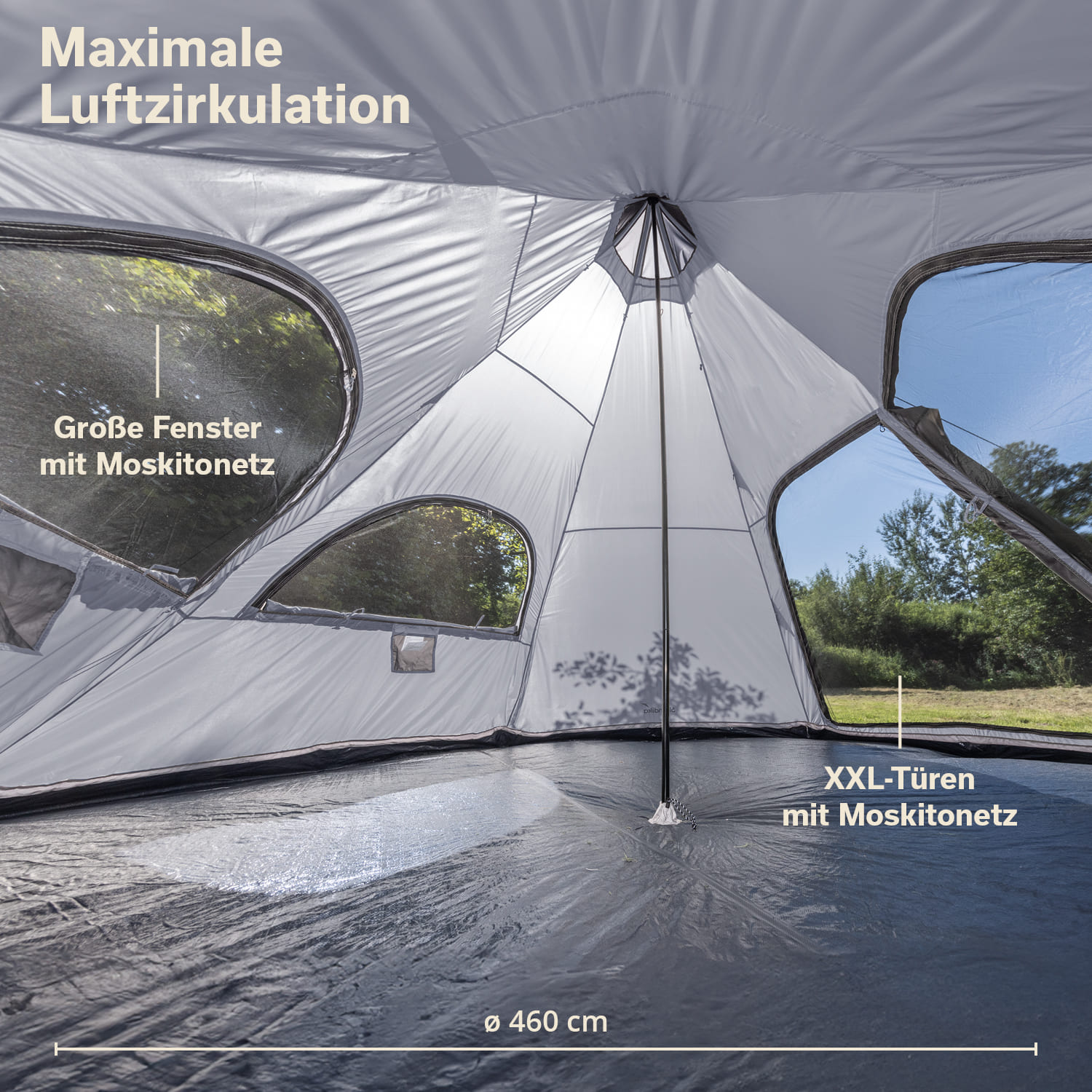 Große Halbmondfenster aus Moskitonetz sorgen für viel Licht und frische Luft. Sie können bei Bedarf wetterfest und blickdicht verschlossen werden. Die Öffnungen in der Dachspitze werden durch Mesh und Außenabdeckungen geschützt und tragen ebenfalls zu dem bei Tipis so bewährten und geschätzten Belüftungskonzept bei.
