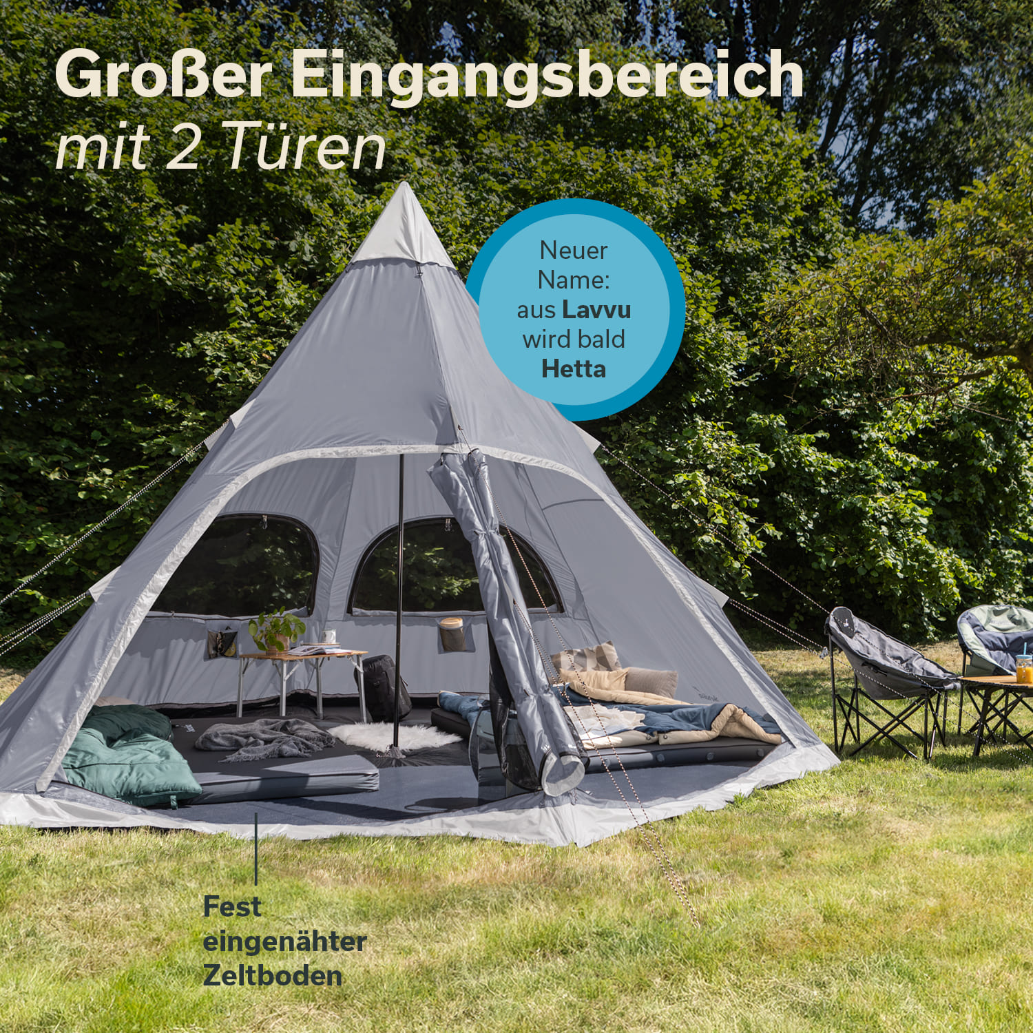 - Fest eingenähter Zeltboden, zweigeteilter Eingang mit mittigem Reißverschluss