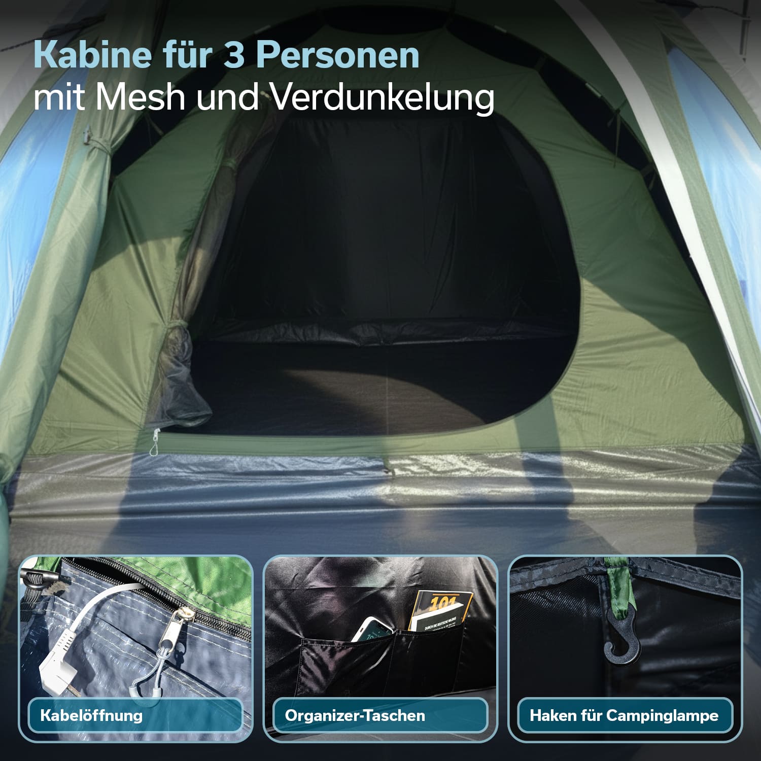 Durch die Bodenwanne können keine Krabbeltiere ins Zelt gelangen und die Moskitonetztür der Schlafkabine hält fliegende Insekten aus dem Schlafbereich fern. So steht einer angenehmen Nachtruhe nichts im Weg.