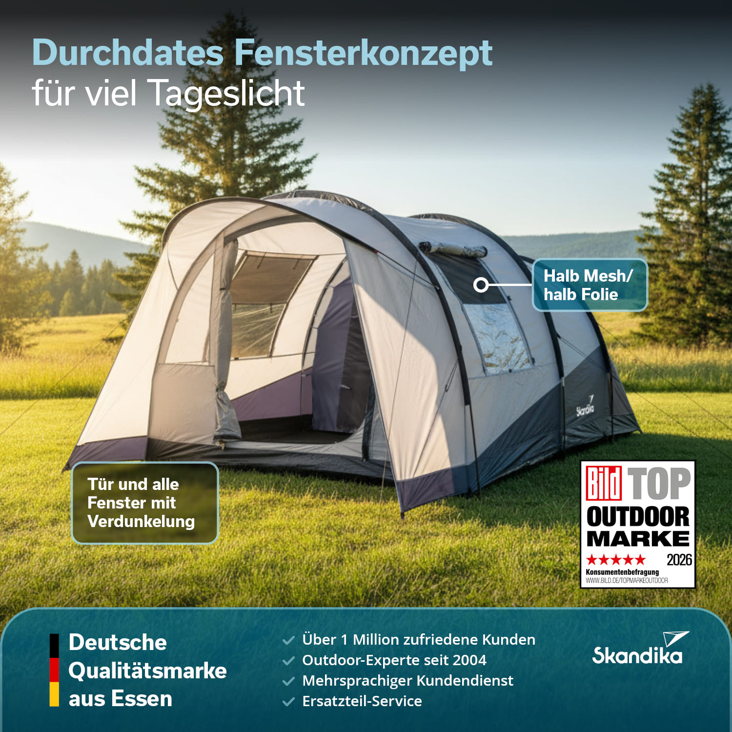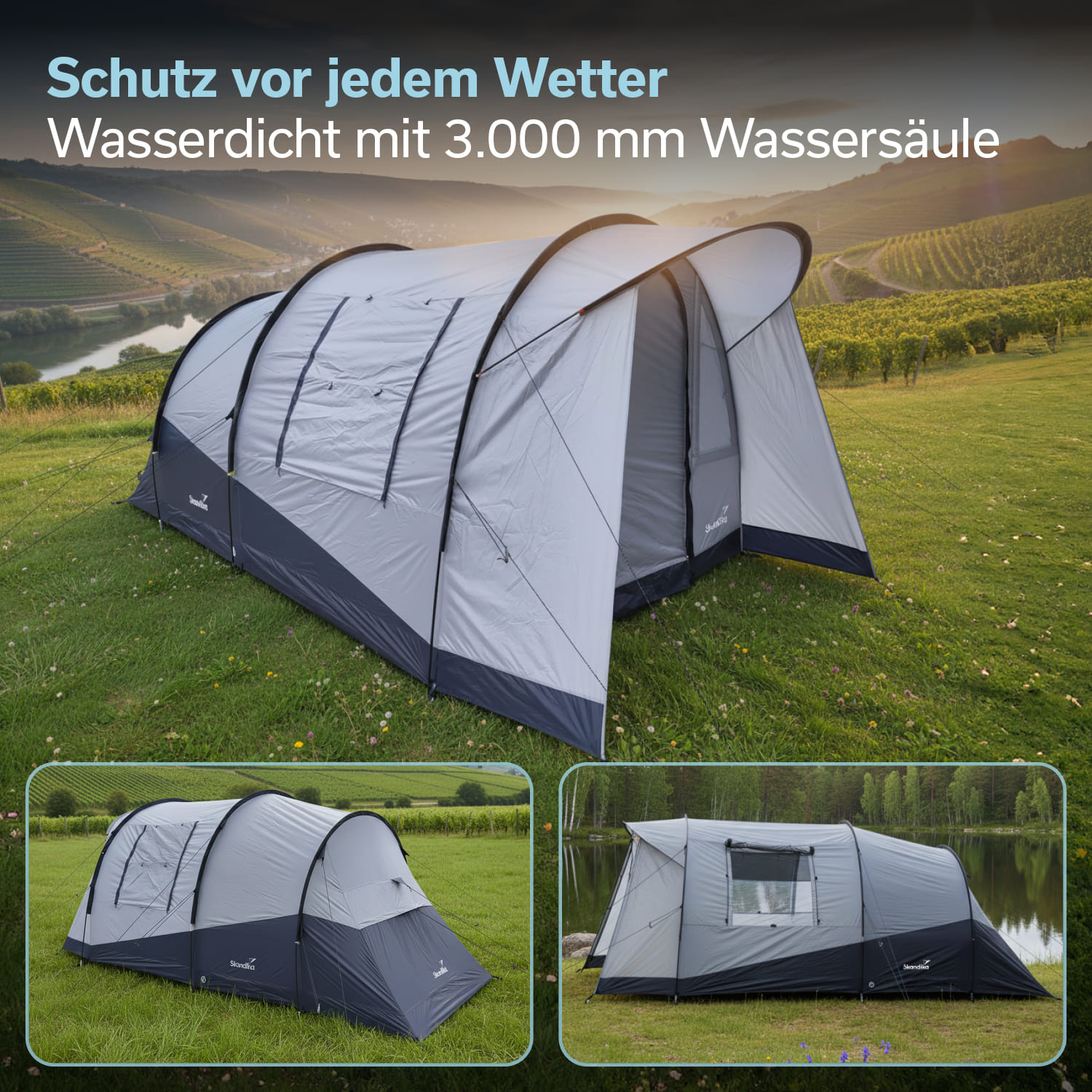 - Tunnelzelt für 3 Personen mit 190 cm Stehhöhe und großzügigem Wohnraum