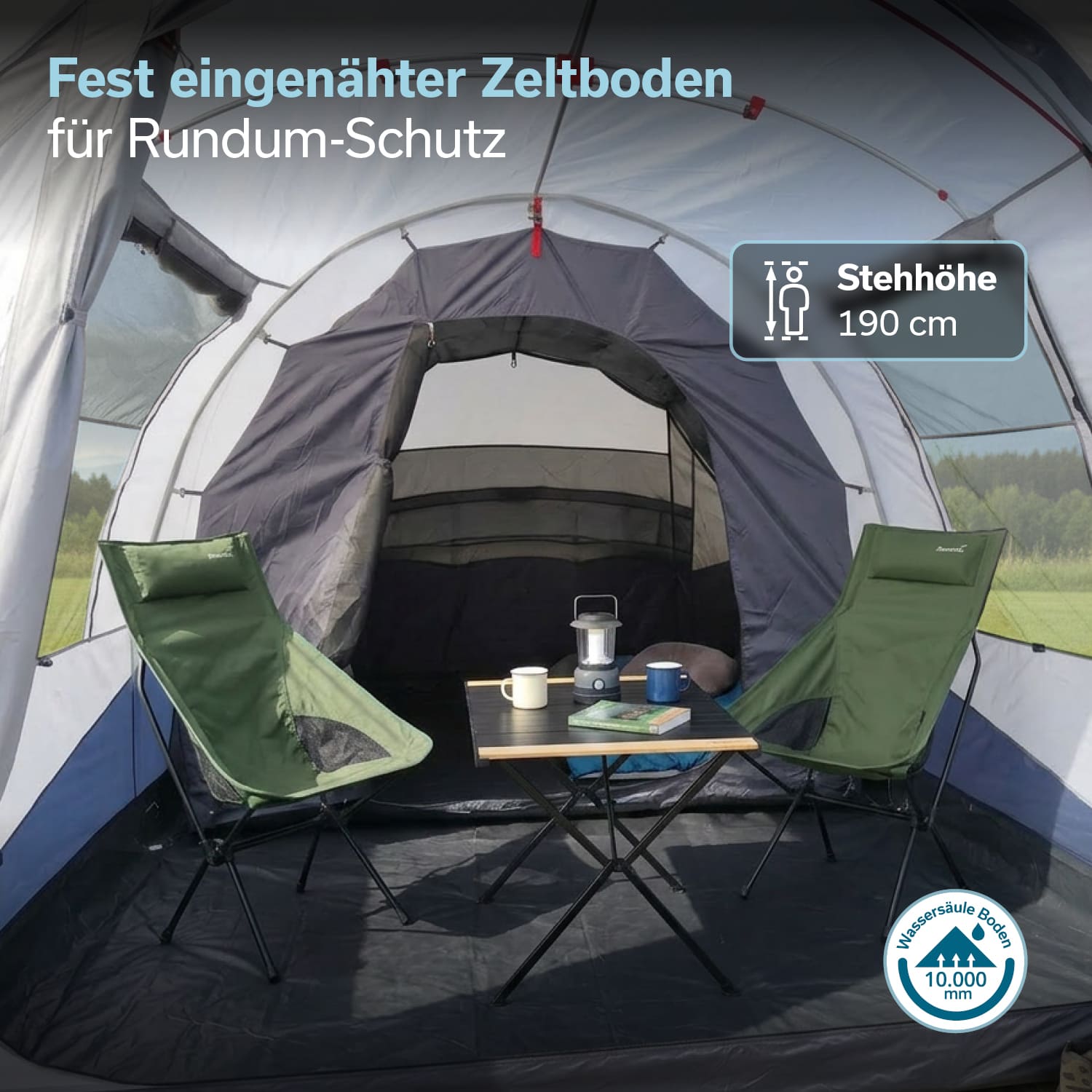 Der vollständig eingenähte Zeltboden bietet umfassenden Schutz vor Feuchtigkeit, Insekten und Zugluft. Zusammen mit Moskitonetzen an Haupteingang, Kabineneingang und den Fenstern entsteht ein durchdachtes Schutzsystem, das auch bei längeren Campingaufenthalten für trockenes und komfortables Wohnen sorgt.