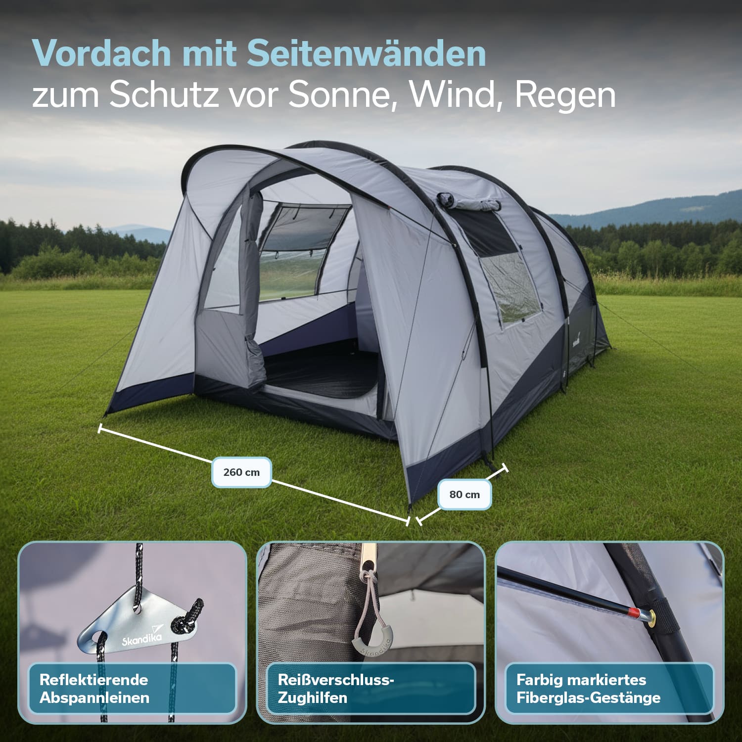 Dank Tunnelform und farbig markierten Stangen ist der Aufbau unkompliziert und zeitsparend. Selbst weniger erfahrene Camper stellen das Zelt zügig auf. Das Fiberglas-Gestänge kombiniert Stabilität und Flexibilität mit geringem Gewicht und sorgt für zuverlässigen Halt auch bei Wind.