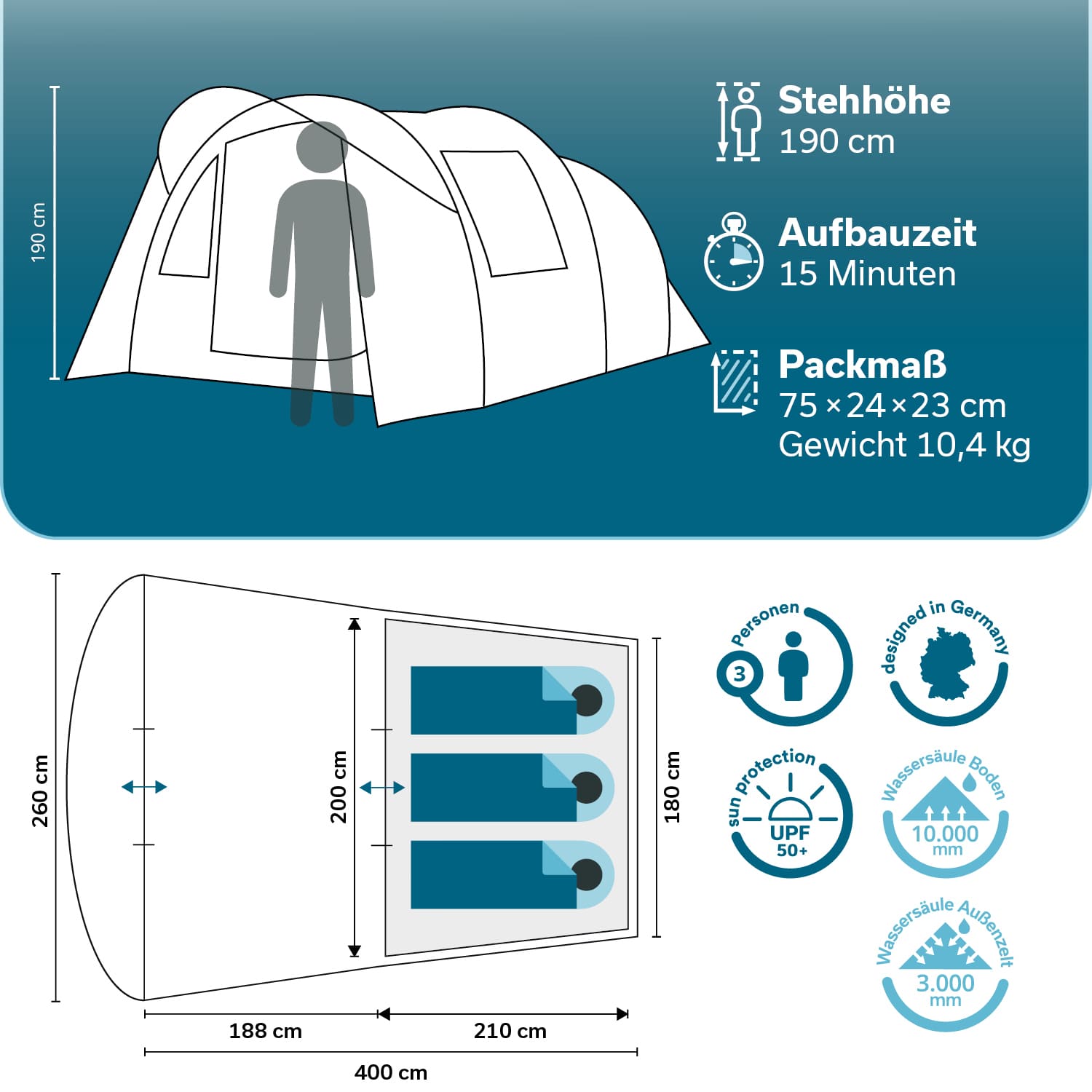 - Außenzelt 400 × 260 cm / Kabine 210 × 180 cm / Packmaß 75 × 24 × 23 cm / Gewicht 10,4 kg