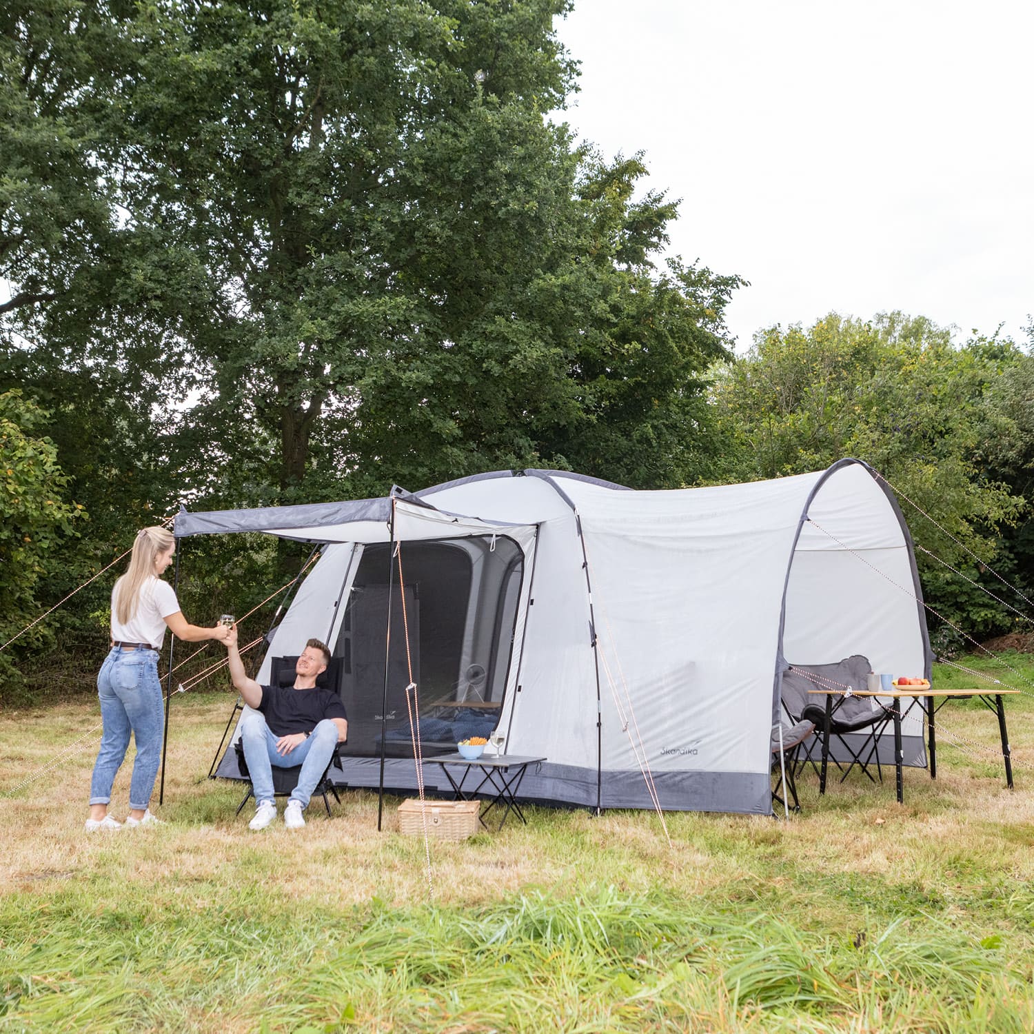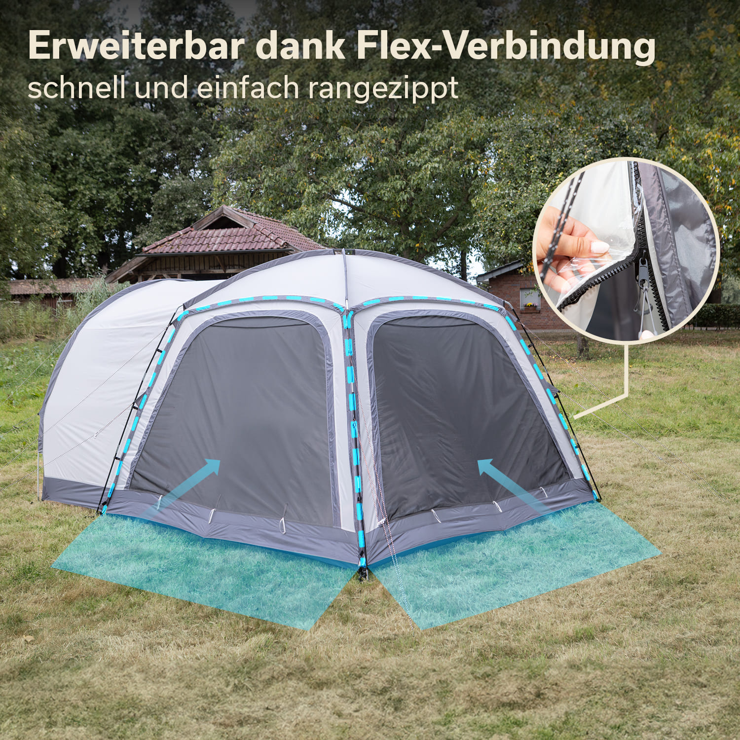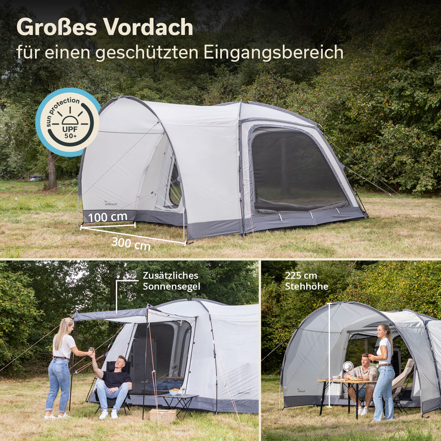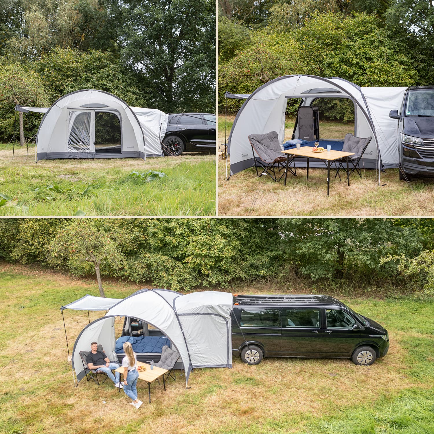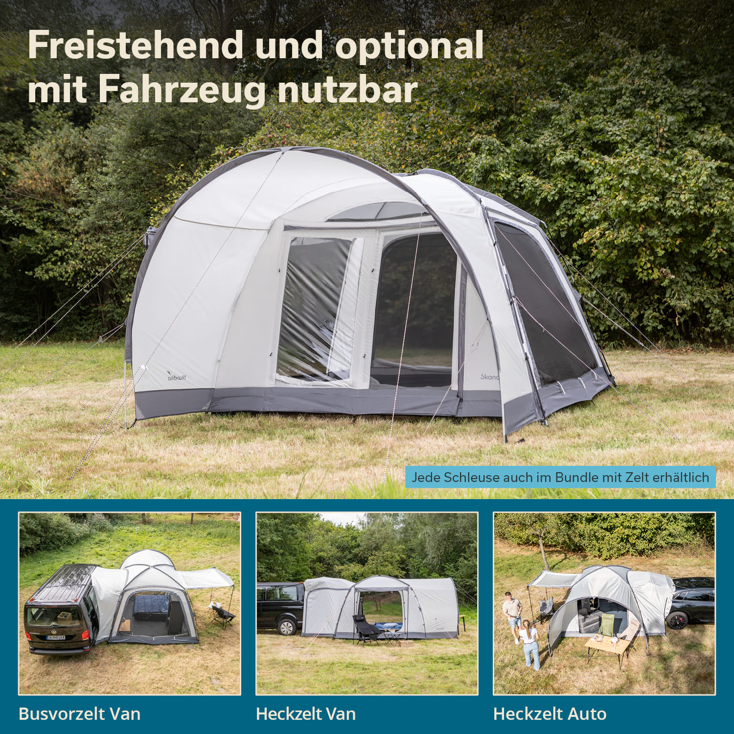 - Freistehendes, quadratisches Kuppelzelt – wandelbar zum praktischen Fahrzeugvorzelt