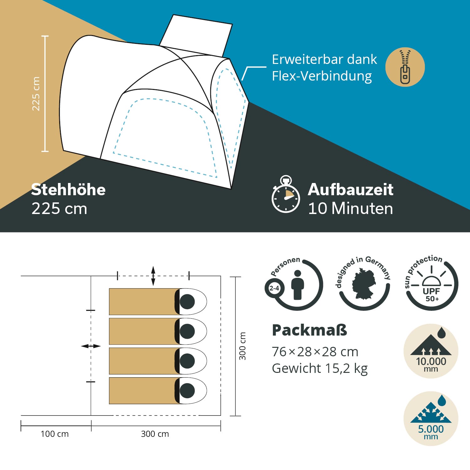 - Größe 300 × 300 + 100 cm / Stehhöhe 225 cm / Packmaß 76 × 28 × 28 cm / Gewicht 15,2 kg