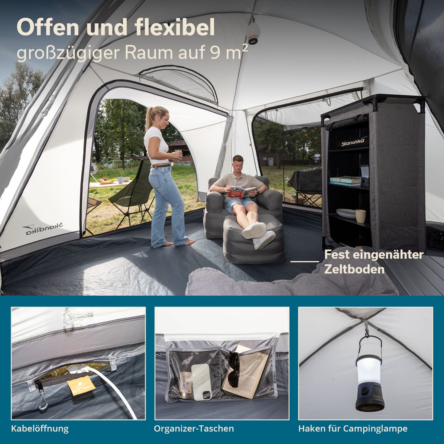 Praktische Extras wie ein Haken für die Aufhängung einer Campinglampe, Organizer-Taschen, eine geschützte Kabelöffnung und reflektierende Abspannseile sorgen für zusätzlichen Komfort und Sicherheit im Campingalltag.