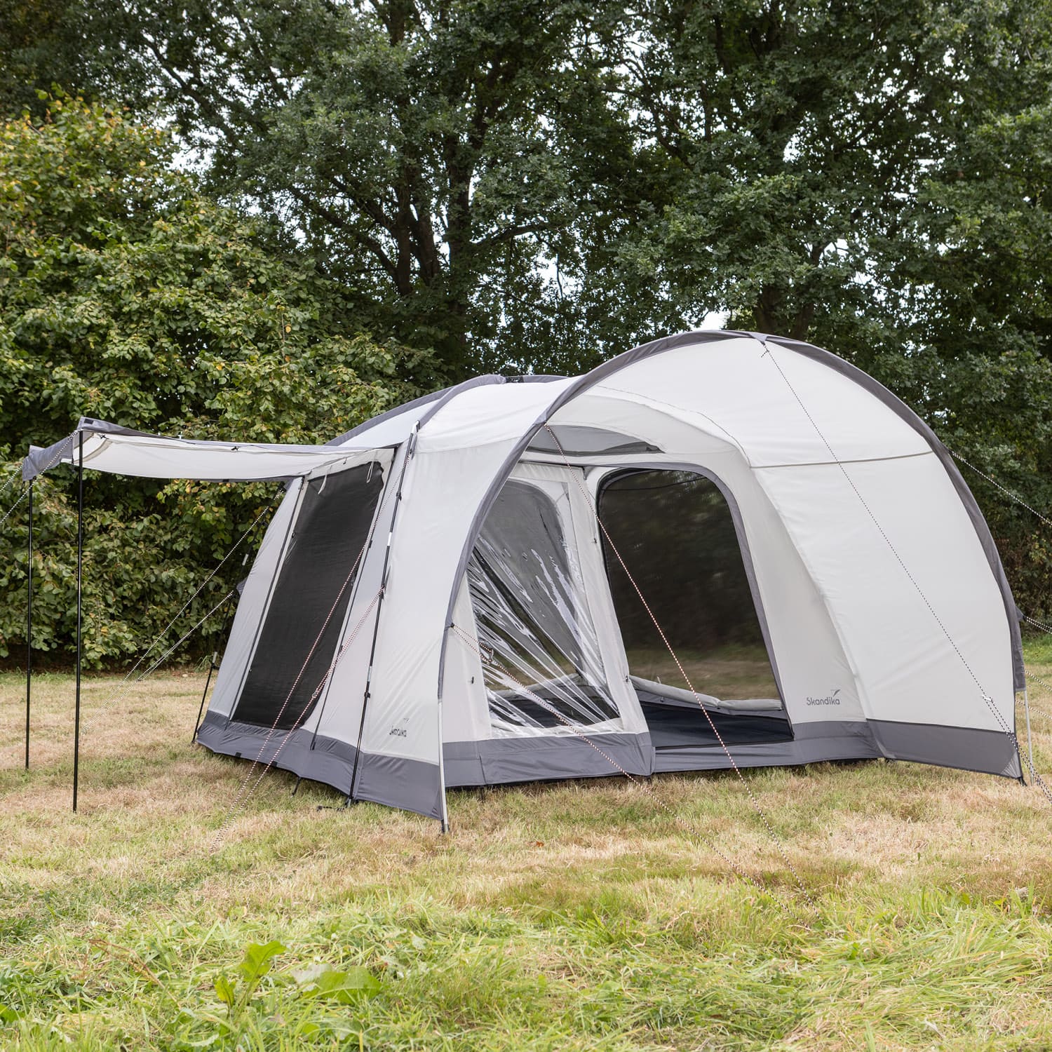 - Fest integriertes Vordach mit Seitenwänden, große Panoramafenster aus Moskitonetz