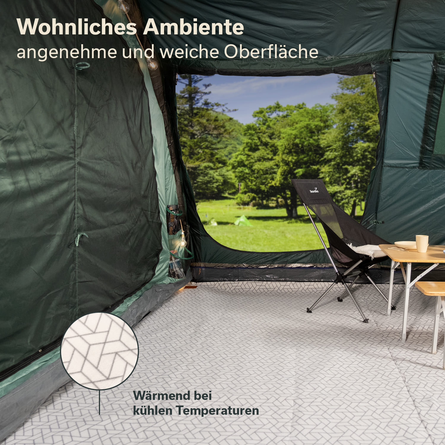 - Teppich mit Softtouch-Fleece-Oberfläche für Wärme und Komfort im Zelt