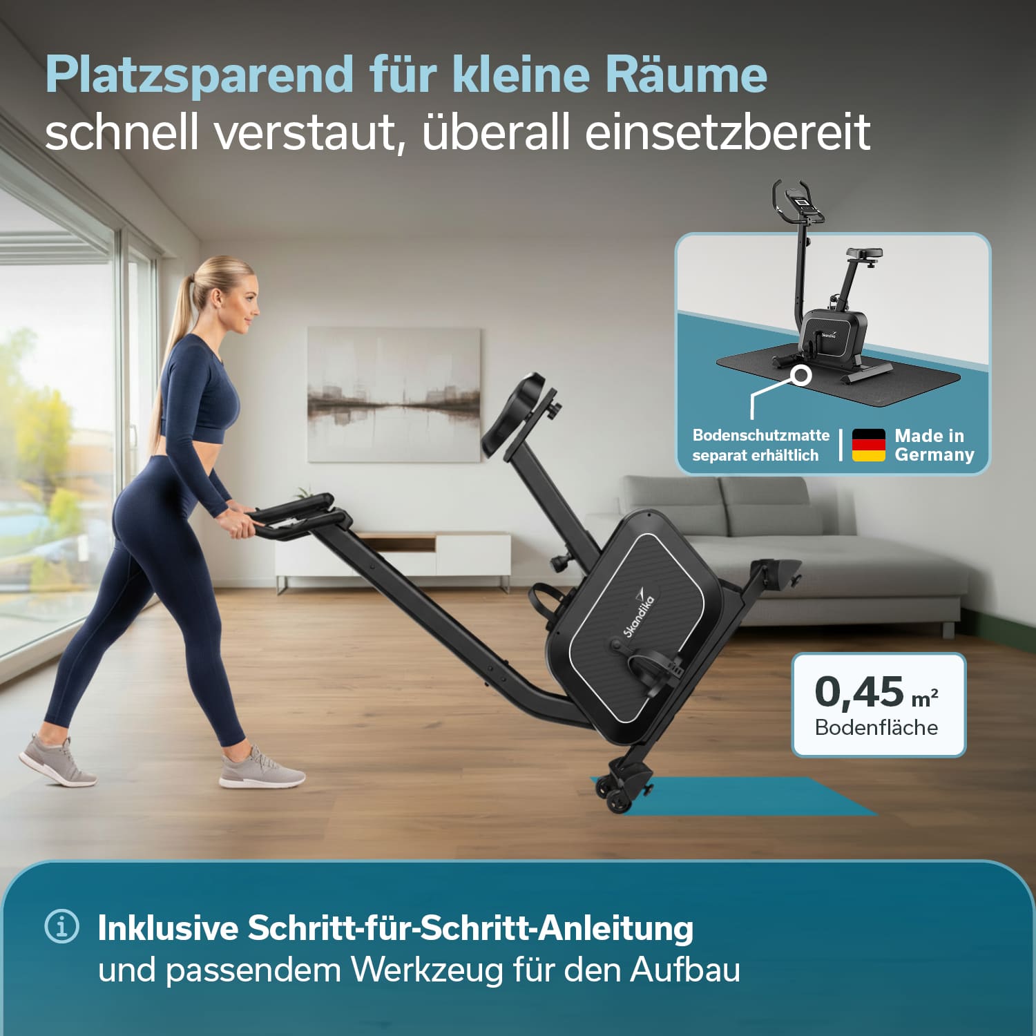 Ob im Wohnzimmer oder im Fitnesskeller, mit seinem kompakten und eleganten Design passt der Heimtrainer in jede Wohnumgebung und bietet effektives Training für Zuhause mit angenehmem Komfort.