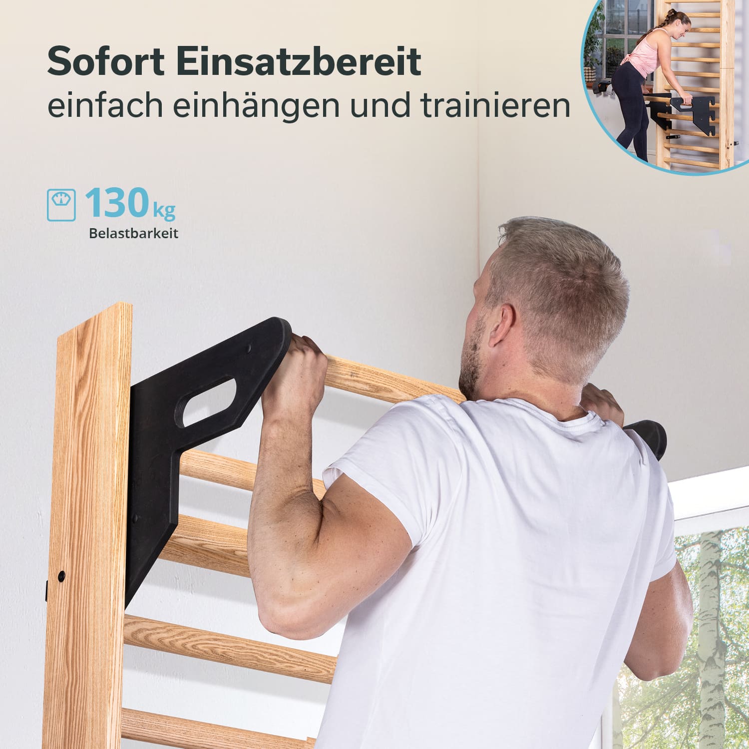 Zwei separate Stangen mit unterschiedlichem Abstand zur Sprossenwand ermöglichen klassische Klimmzüge, ebenso wie Beinheben und weitere Übungen zur Stärkung der Körpermitte, Arme, Beine und des Rückens. So wird das Training noch abwechslungsreicher!