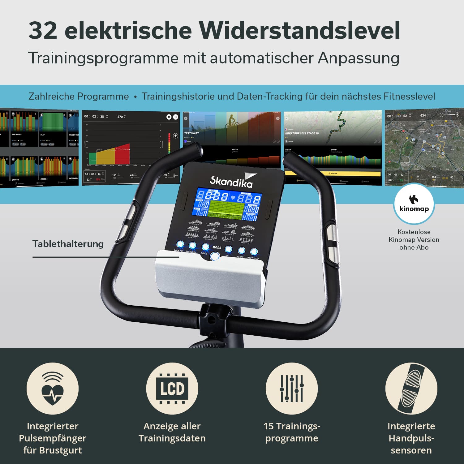 - 15 Trainingsprogramme und 32 Widerstandsstufen für abwechslungsreiches Training