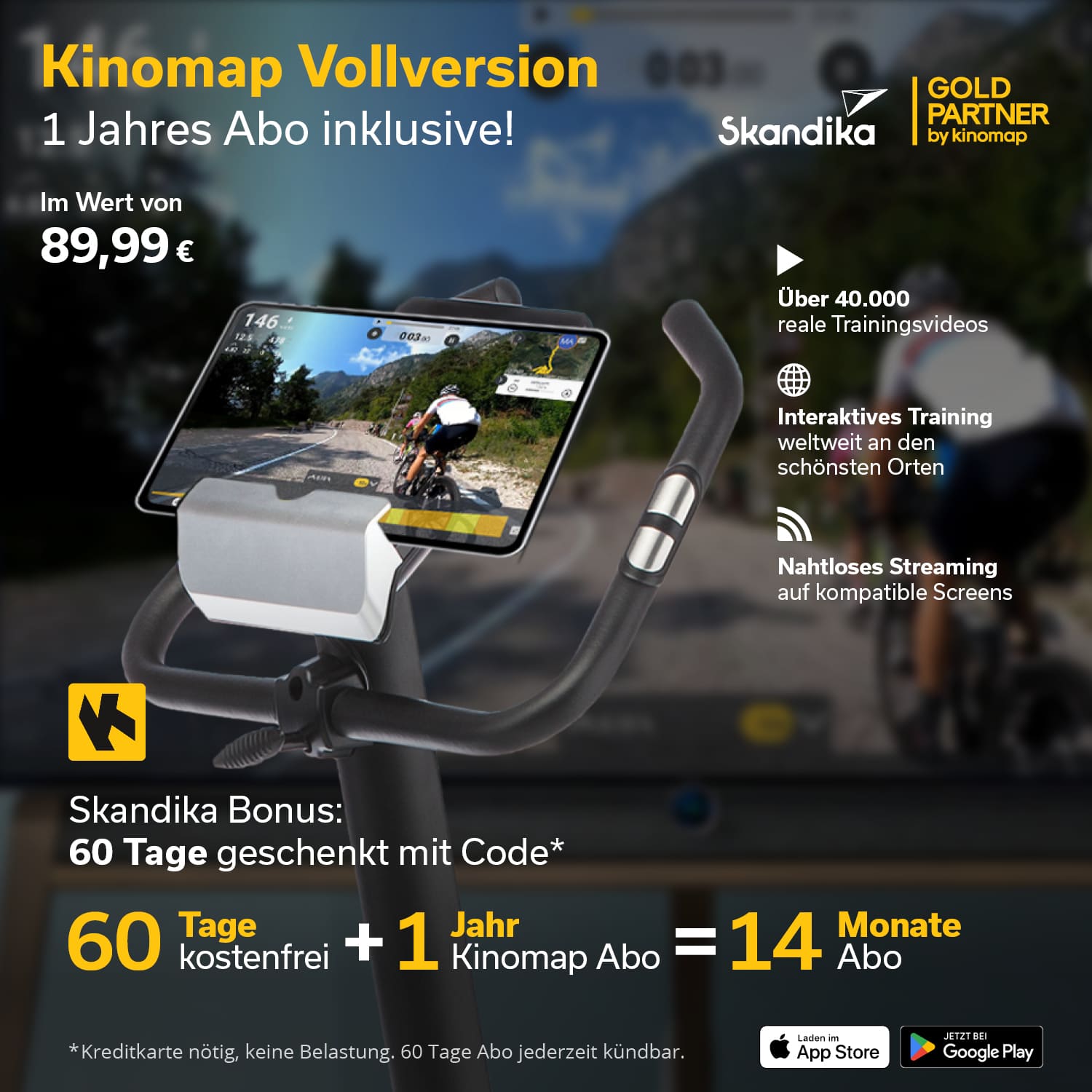 Dieses Bundle beinhaltet ein Jahresabo für Kinomap im Wert von 89.99€ und zusätzlich einen Code, um die Vollversion der App weitere 60 Tage kostenfrei zu testen – für insgesamt 14 Monate Live-Videos, Coachings und virtuelle Trainingsvideos, die jede Trainingseinheit auf ein neues Level bringen.