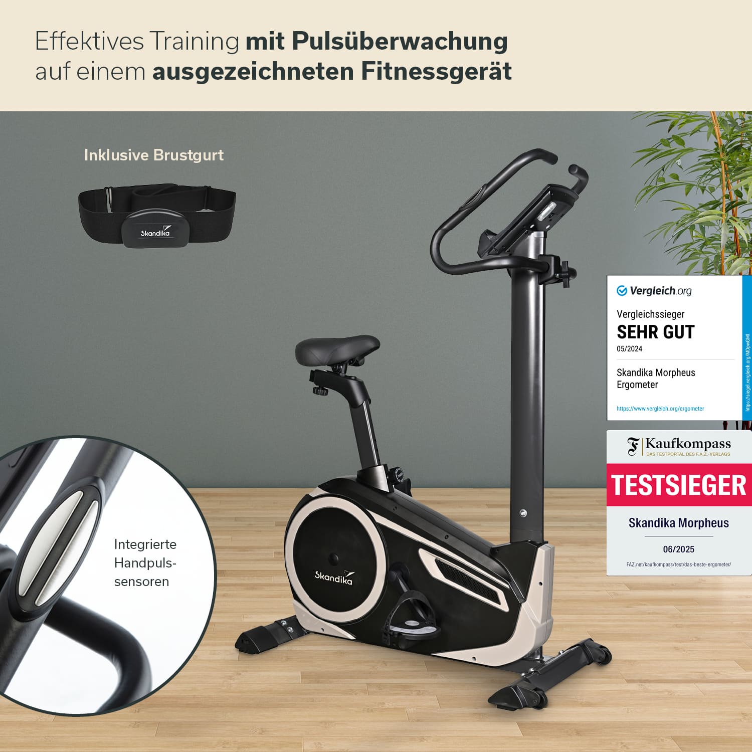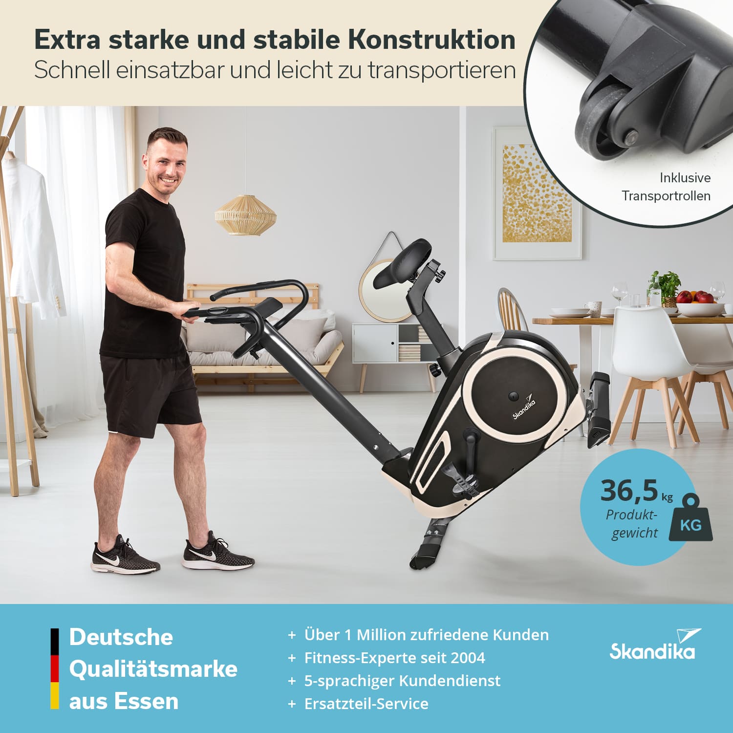 - Bequemer, gepolsterter Sattel, Pulssensoren im Lenker, Transportrollen, Skandika Brustgurt