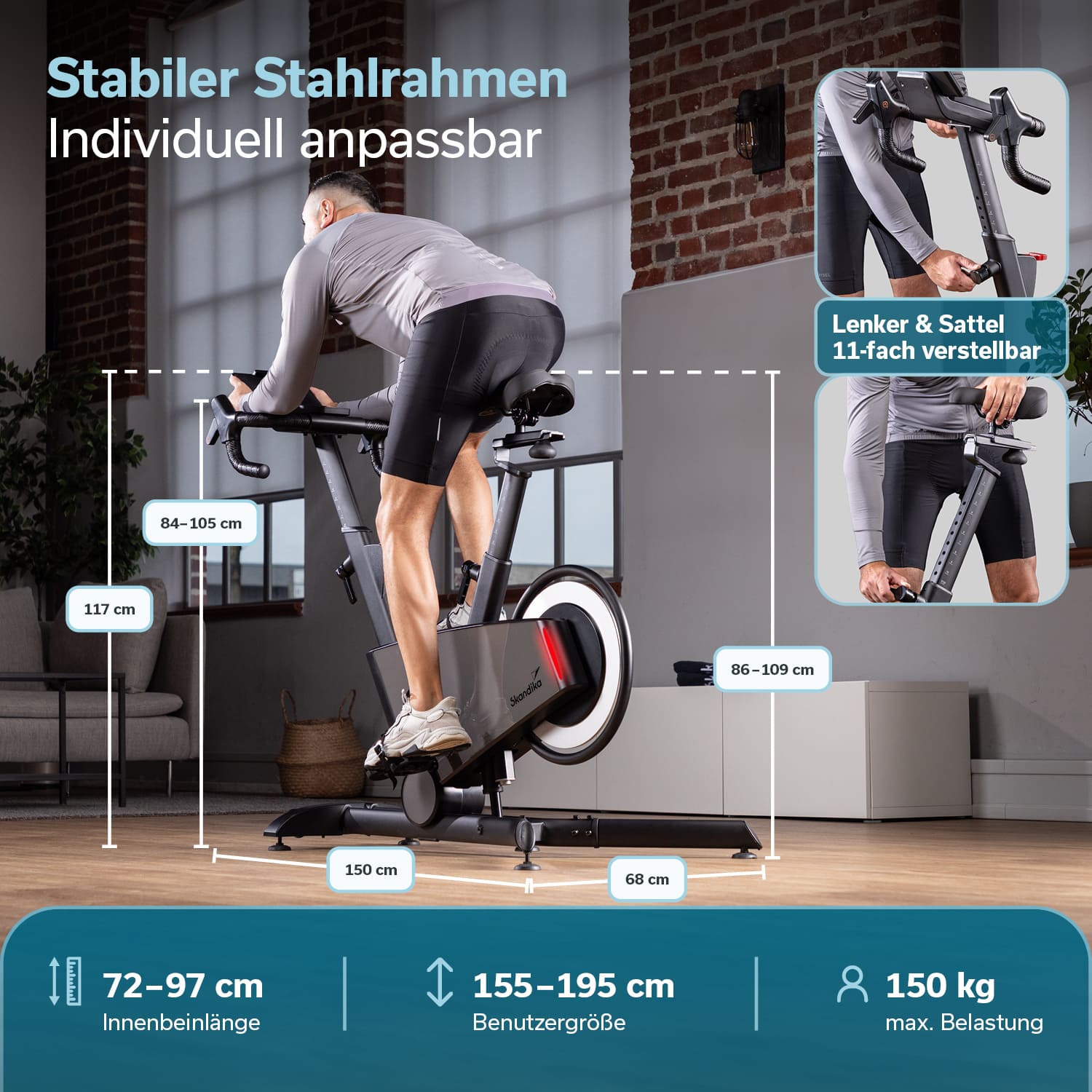Sattel und Lenker sind jeweils 11-fach höhenverstellbar, wobei sich der Sattel zusätzlich stufenlos horizontal anpassen lässt. Das Gerät eignet sich für Innenbeinlängen von 72 bis 97 cm. Darüber hinaus empfehlen wir eine Körpergröße im Bereich von etwa 155 bis 195 cm, um eine besonders angenehme und ergonomische Nutzung zu erreichen.