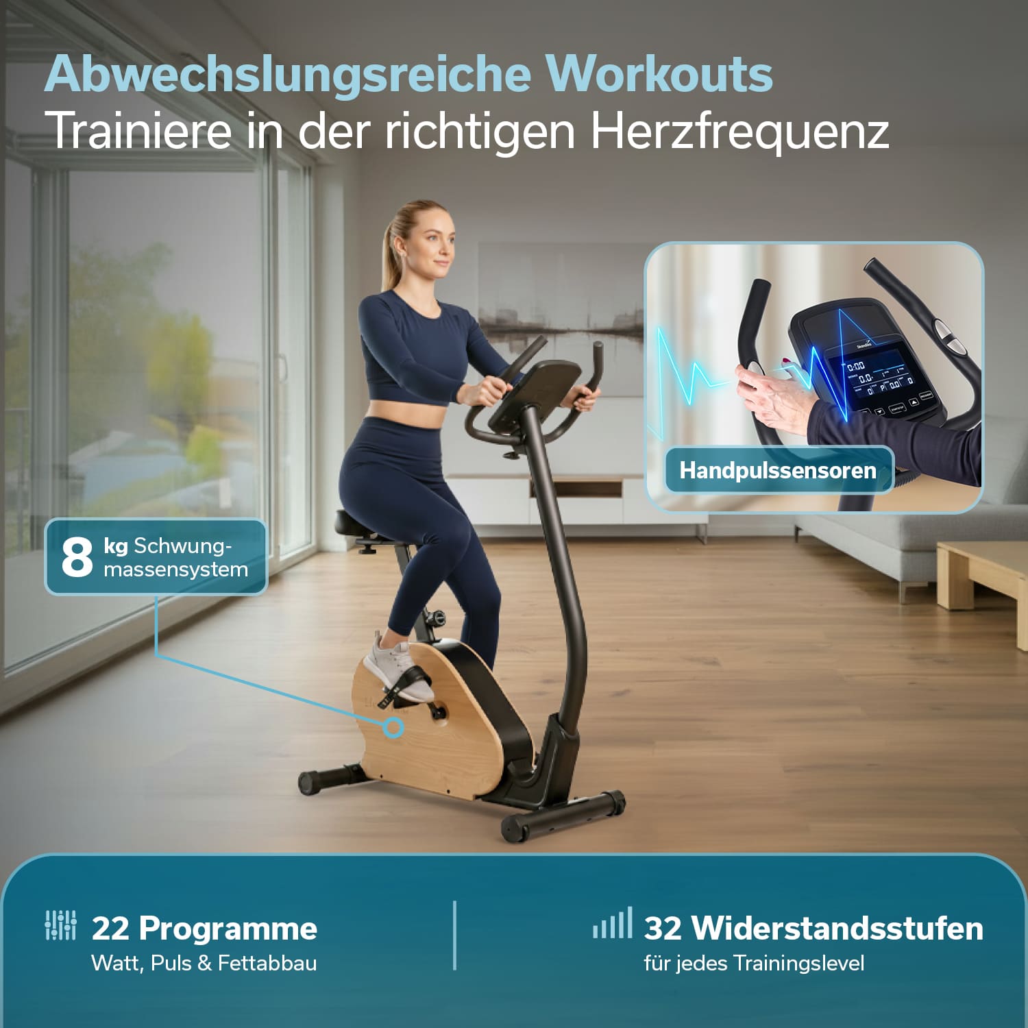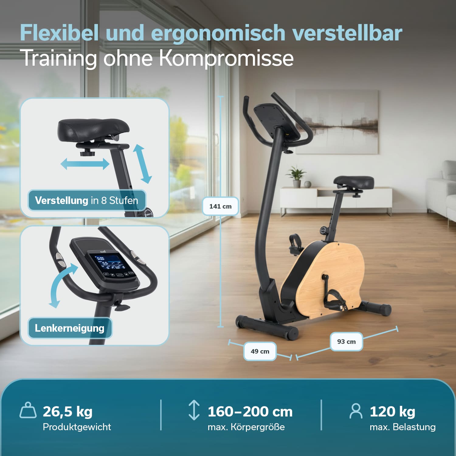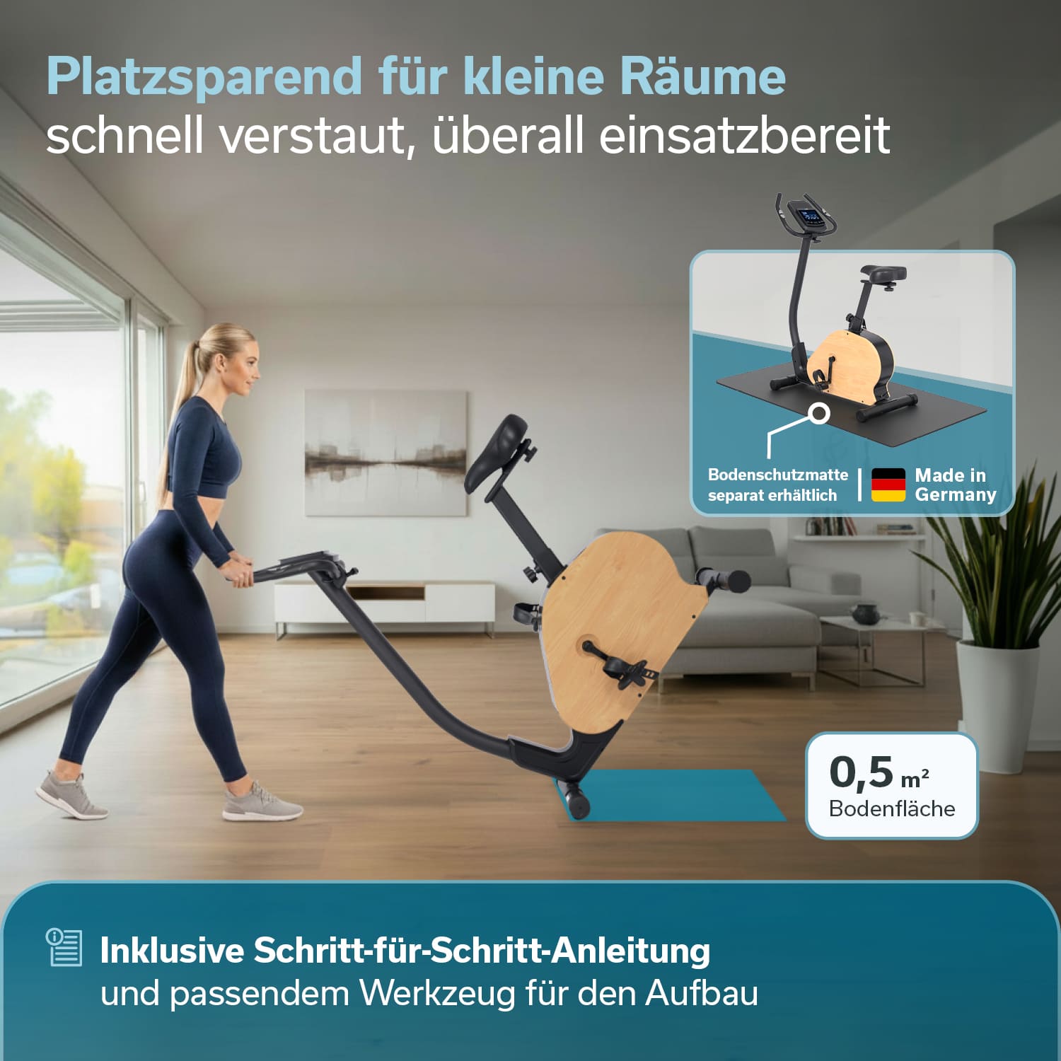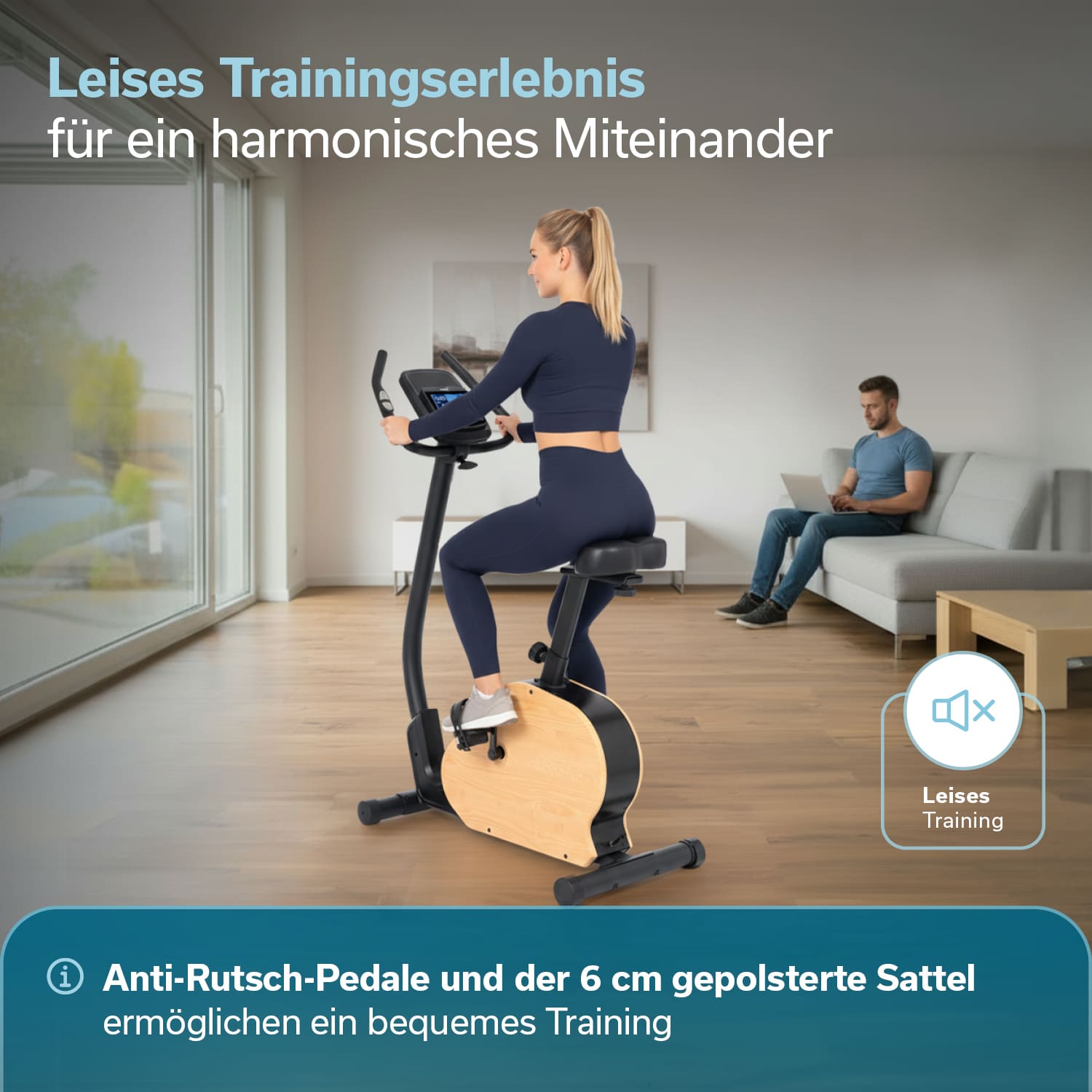 - Leistungsstarkes Ergometer aus robustem Eisen mit hochwertigen Echtholz-Elementen