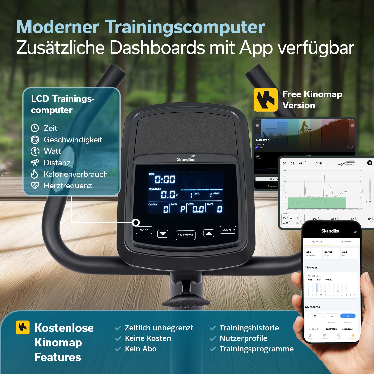 Integrierte Handpulssensoren im Lenker ermöglichen eine zuverlässige Pulsmessung in Echtzeit. Alternativ kann der Puls über einen kompatiblen Bluetooth-Brustgurt (separat bei Skandika erhältlich) gemessen werden.