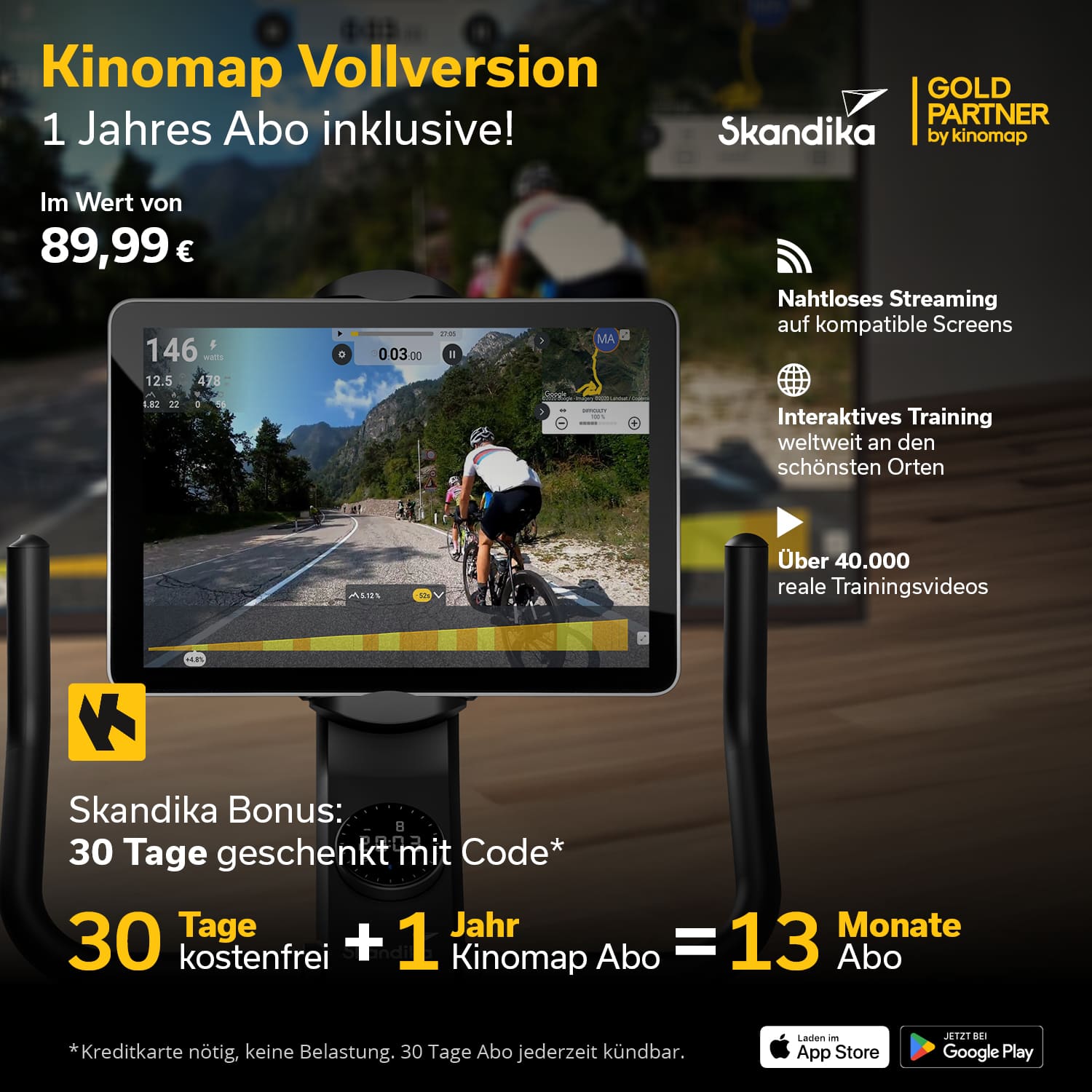 Über die integrierte Bluetooth-Schnittstelle können Trainingsapps wie Kinomap genutzt werden. Dieses Bundle beinhaltet ein Jahresabo für Kinomap im Wert von 89,99 € und zusätzlich einen Code, um die Vollversion der App weitere 30 Tage kostenfrei zu testen – für insgesamt 13 Monate Live-Videos, Coachings und virtuelle Trainingsvideos, die jede Trainingseinheit auf ein neues Level bringen.