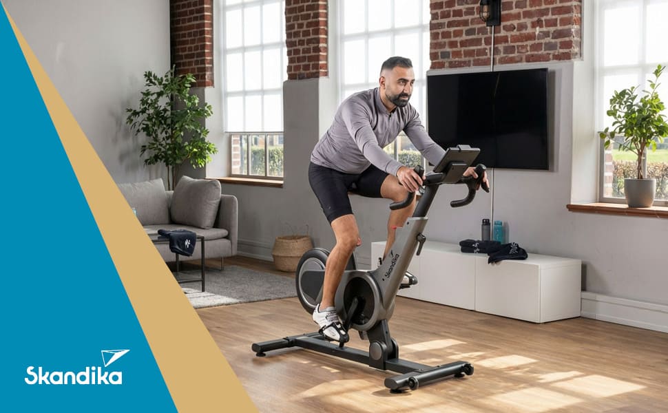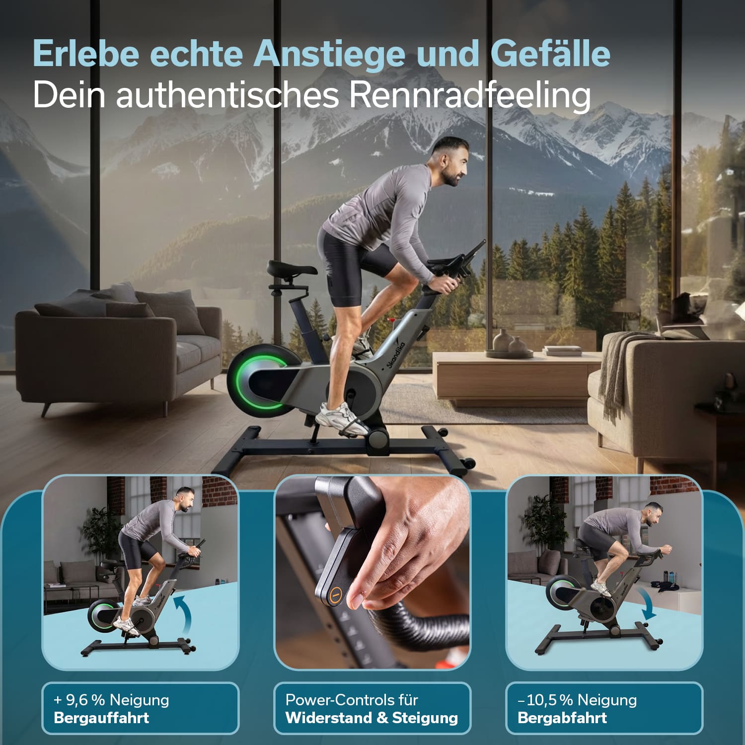 Das Skandika Speedbike Kliva 500-S bietet mit über 500 Watt Trainingsleistung ein intensives Indoor-Cycling-Erlebnis. Die Besonderheit liegt in der intelligenten Steigungssimulation: Das smarte Speedbike bildet Anstiege und Abfahrten nicht ausschließlich über den Widerstand ab, sondern neigt sich tatsächlich nach vorne und hinten. Der integrierte Steigungsmotor bewegt das komplette Bike und erzeugt dadurch ein Fahrgefühl, das dem Training auf echten Straßen verblüffend nahekommt.