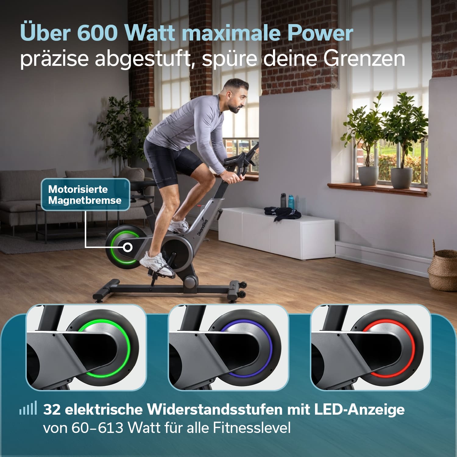 • 32 computergesteuerte Widerstandsstufen mit elektrischer Magnetbremse für 60 bis 613 Watt Trainingsleistung
