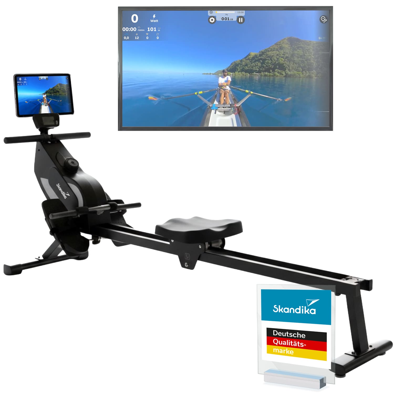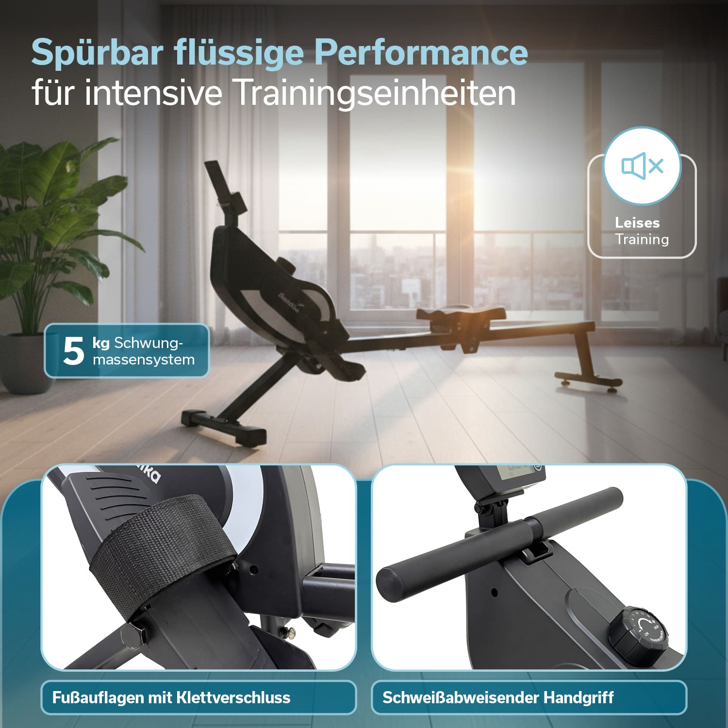 Das Schwungmassensystem von 5 kg, das nahezu wartungsfreie Magnetbremssystem und der Mittelzug ermöglichen eine flüssige Ruderbewegung.