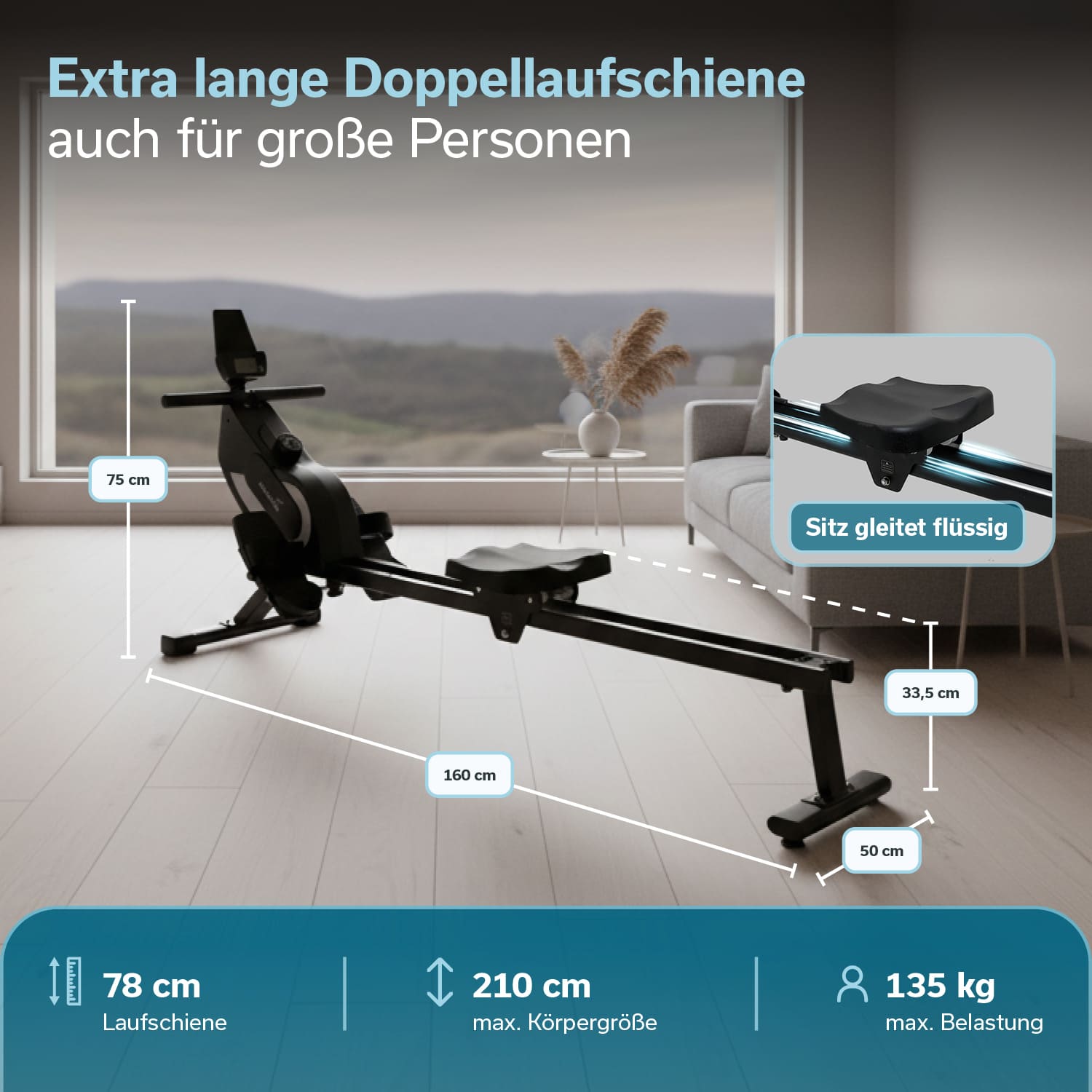 - Modernes Rudergerät mit extra langer Laufschiene für komfortables Training zuhause