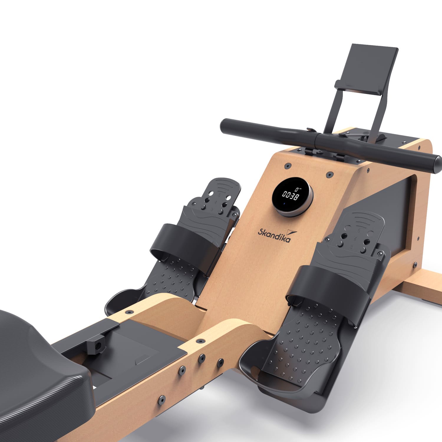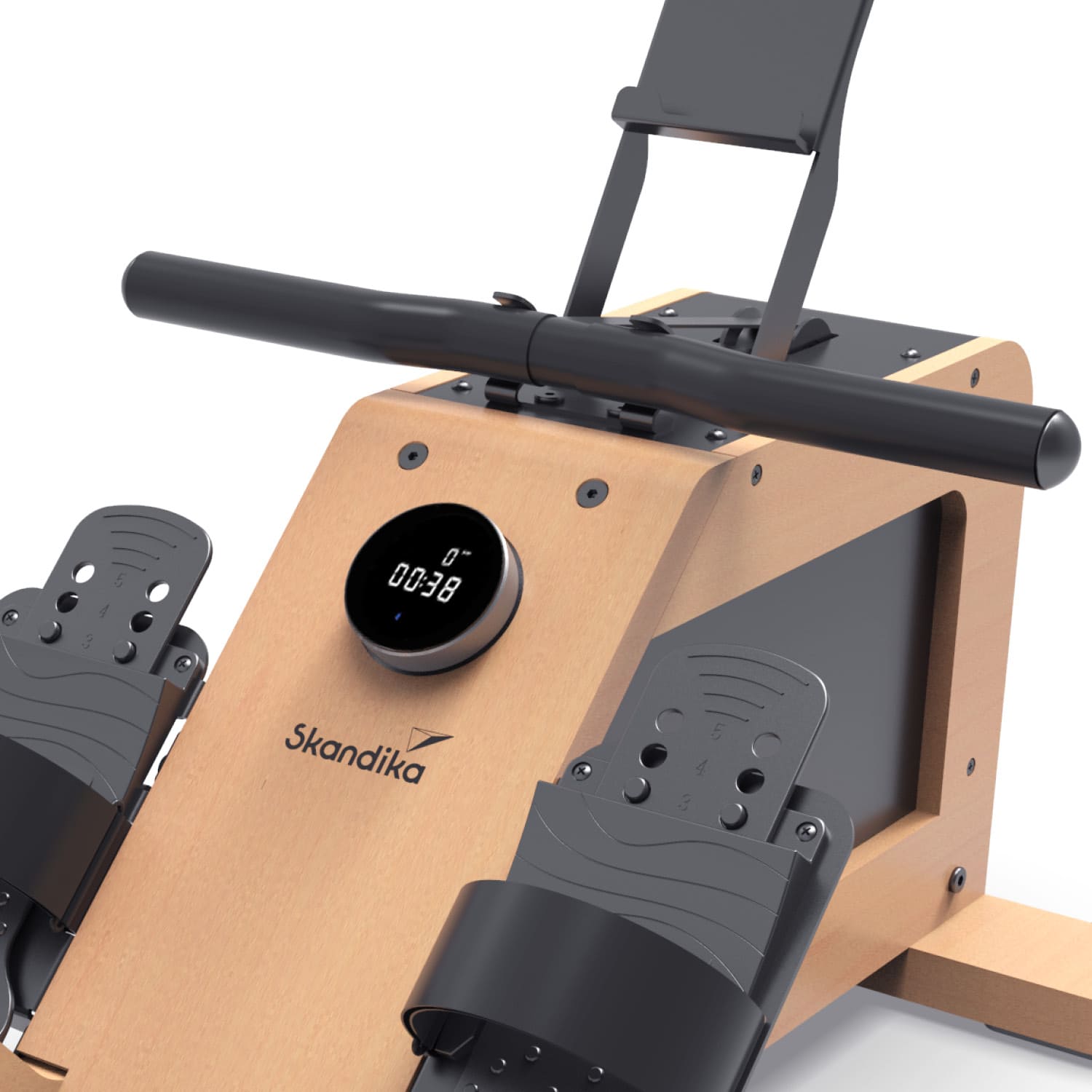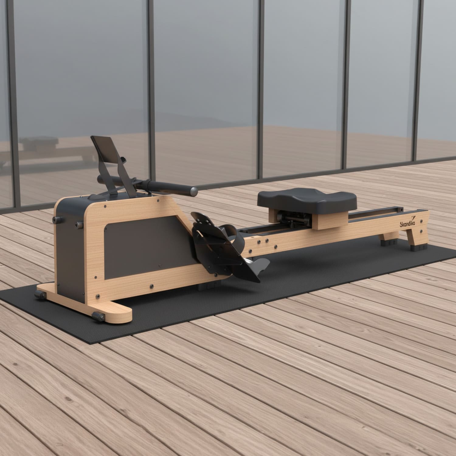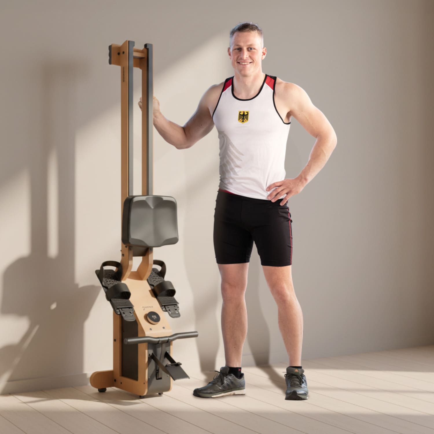 Helles Buchenholz trifft auf schwarze Akzente an Rahmen und Schienen und schafft einen modernen Kontrast, der sich harmonisch in verschiedene Wohnumgebungen einfügt. Das minimalistische Design beeindruckt durch seine durchdachte Formensprache und macht das Rudergerät zu einem ästhetischen Highlight, das über reine Funktionalität hinausgeht. Nachhaltigkeit und Eleganz vereinen sich in einem Trainingsgerät.