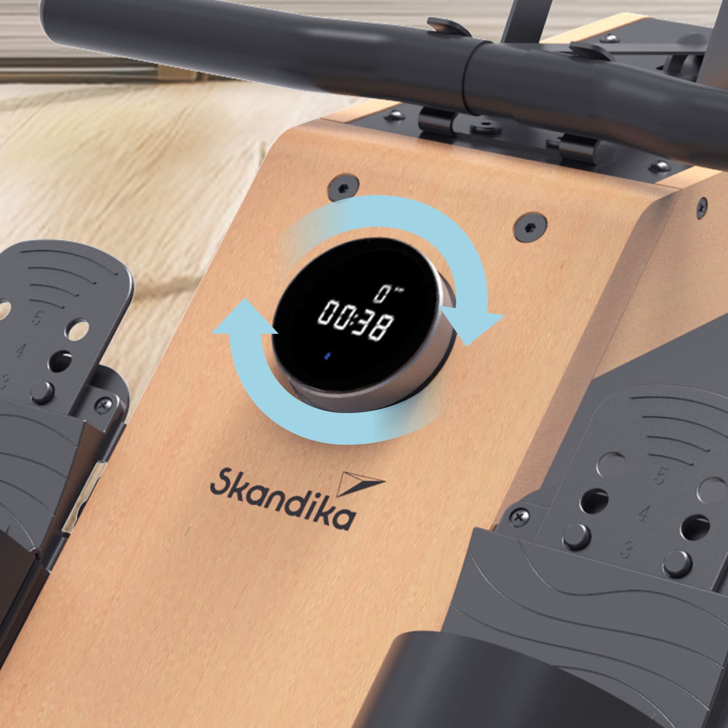 Der integrierte Drehregler ermöglicht die stufenlose Einstellung der 32 Widerstandsstufen und zeigt alle relevanten Trainingsdaten an. Ein besonderes Highlight bildet der äußere LED-Ring, der mit zunehmender Geschwindigkeit und steigenden Ruderschlägen immer mehr Leuchtdioden aktiviert. Dieser visuelle Effekt motiviert während des Trainings und gibt direktes Feedback zur aktuellen Leistung.