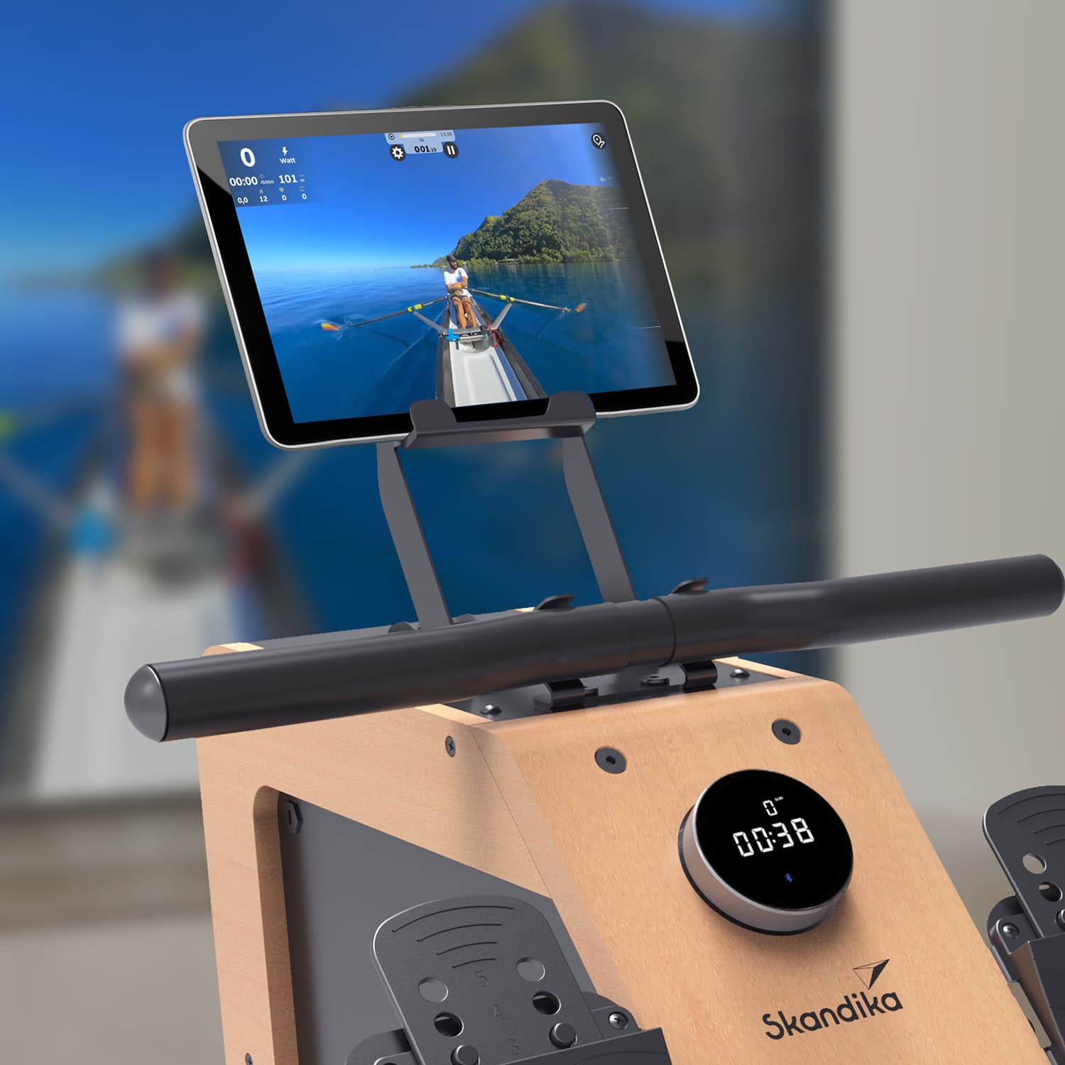 Über Bluetooth wird das Rudergerät mit Apps wie Kinomap gekoppelt für noch mehr Abwechslung beim Training. Die Bluetooth-Schnittstelle ermöglicht zudem die Nutzung eines Brustgurts (im Skandika Shop separat erhältlich), damit die Herzfrequenz in Echtzeit überwacht werden kann. Während des Workouts werden mobile Endgeräte in der praktischen Tablet-Halterung sicher aufbewahrt.