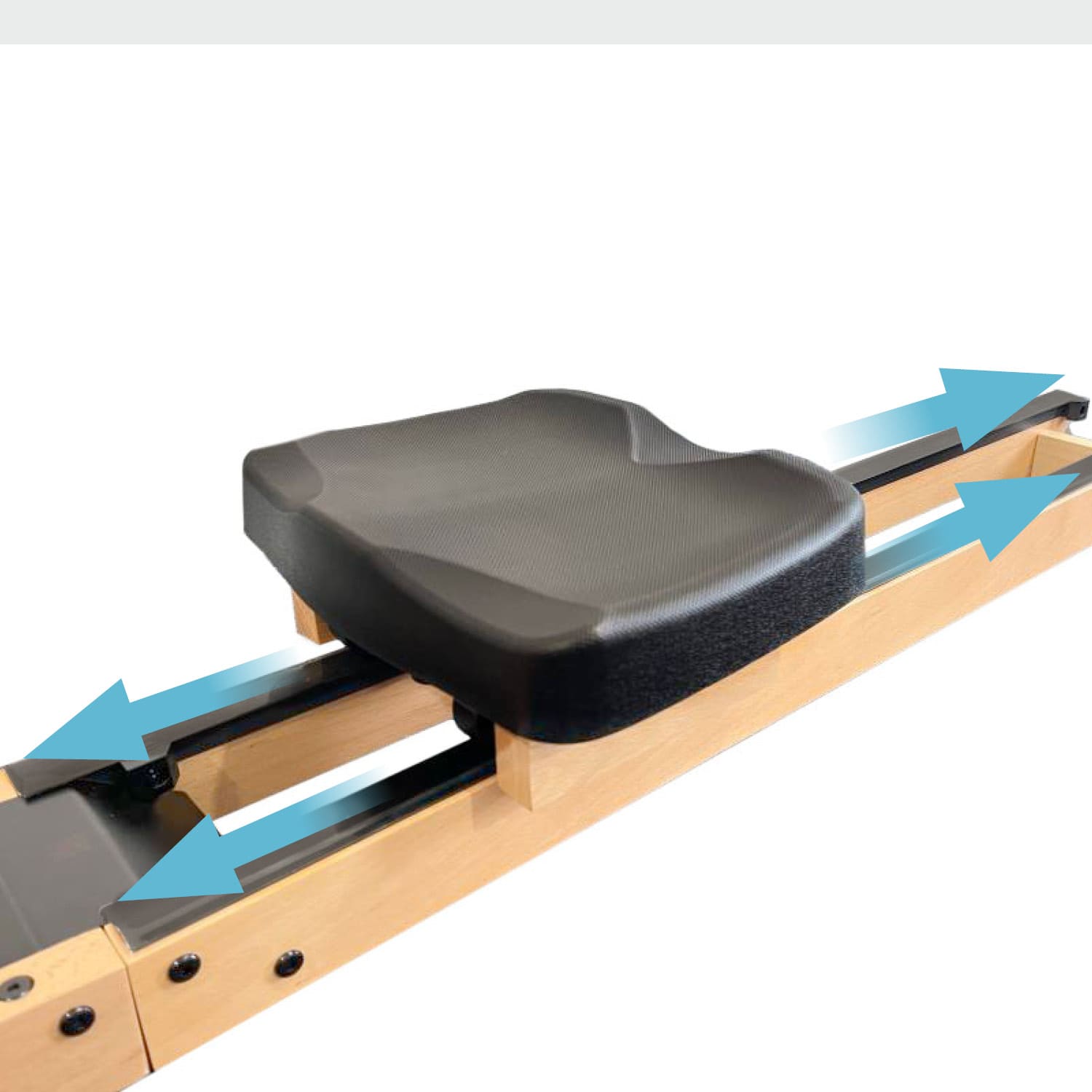 Die clevere Doppelschienenkonstruktion gewährt ein Maximum an Stabilität und ermöglicht ein außergewöhnlich leises Gleiten des gut gepolsterten Sitzes. Sie trägt Trainierende bis 150 kg Körpergewicht sicher und bietet mit 91 cm nutzbarer Schienenlänge auch großgewachsenen Personen bis 200 cm ausreichend Bewegungsfreiheit.
