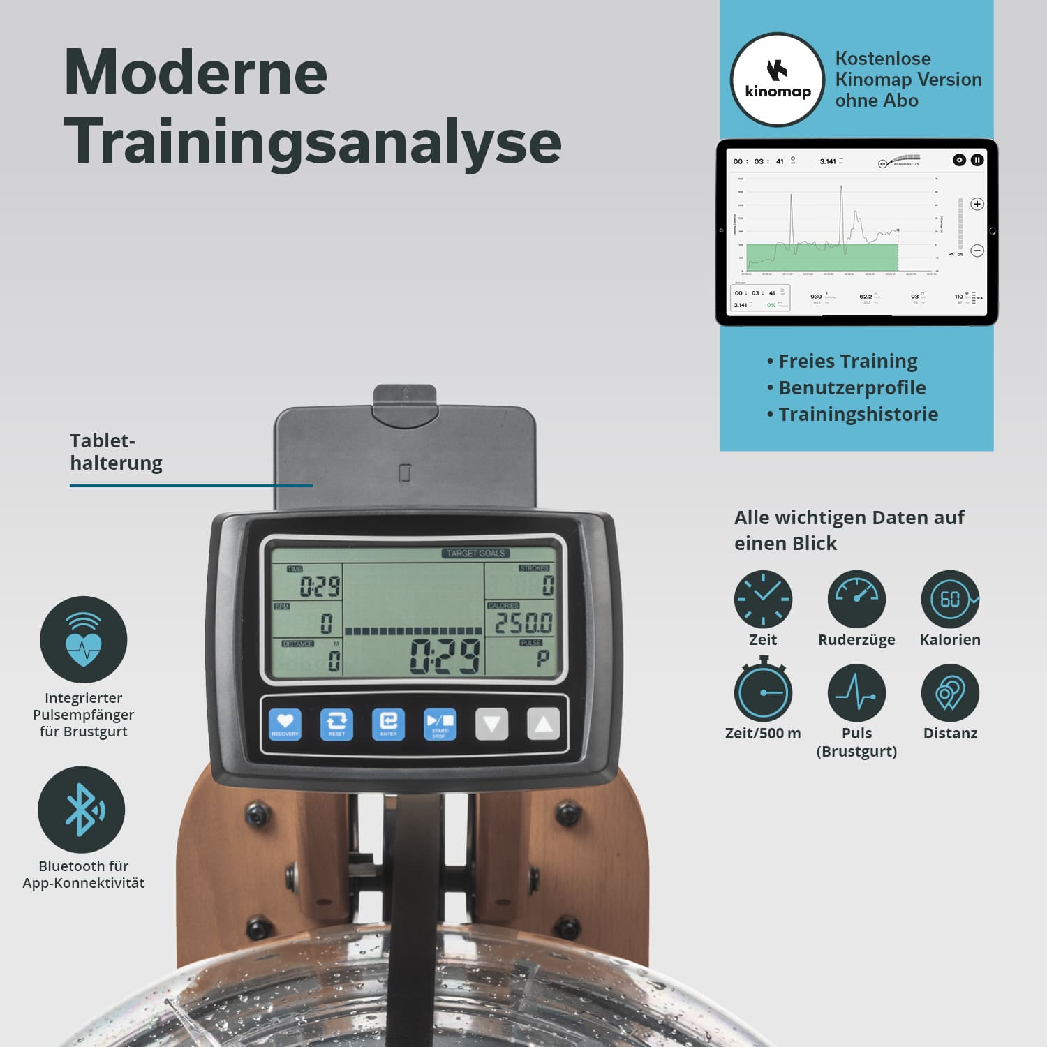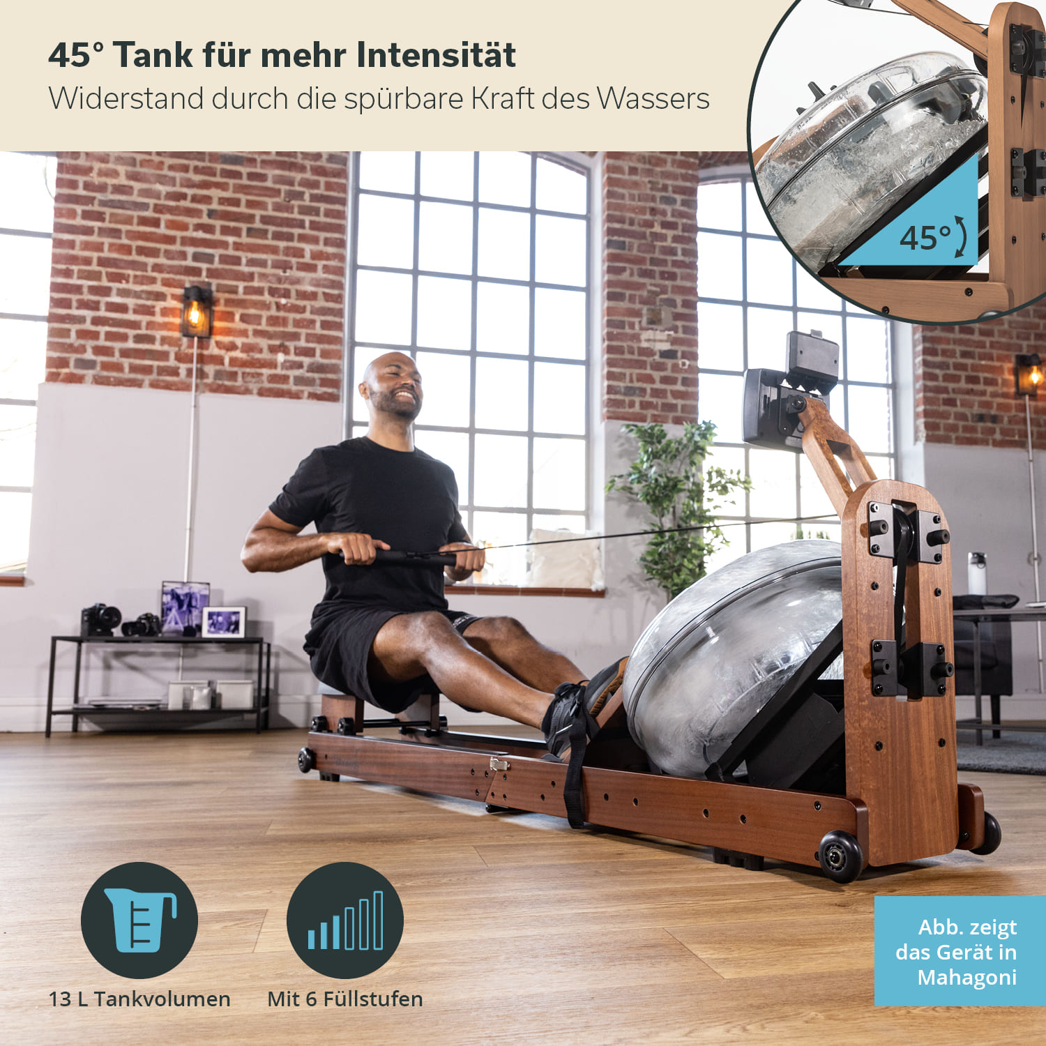 Durch die 45 Grad aufgestellten Ruderblätter wird ein größerer Widerstand erzeugt, der sich in den Trainingsergebnissen widerspiegelt. Das harmonische Trainingsgeräusch des Wassers schafft eine natürliche Atmosphäre und die geschmeidige Bewegung führt zu einem fließenden Trainingsablauf.